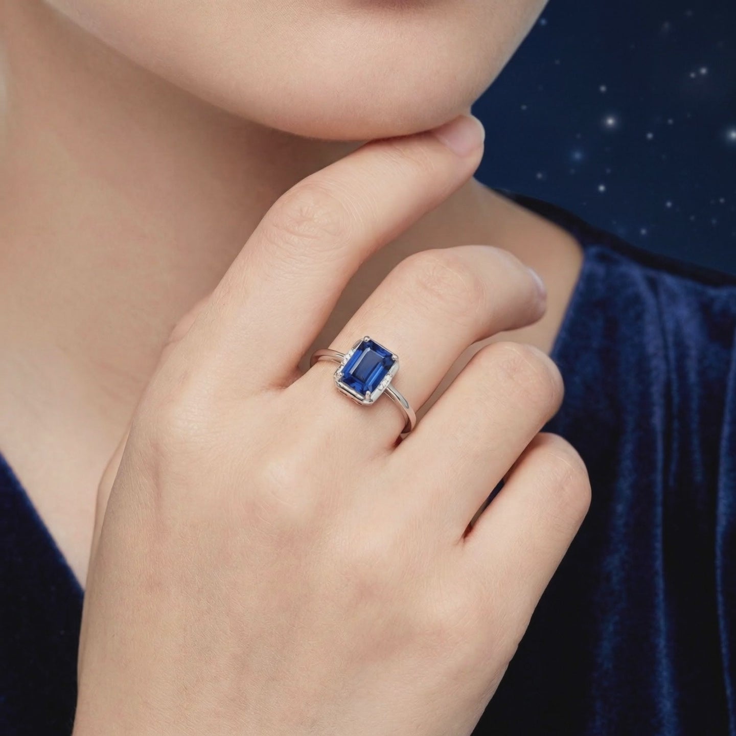 SaleEmerald cut simulated sapphire ring in sterling silver on a dark blue velvet background with starry accents.