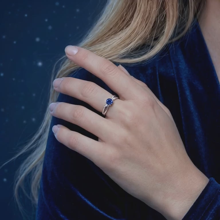 SaleIsaraea S925 sterling silver twist ring with a round royal blue simulated sapphire on a starry blue velvet background.