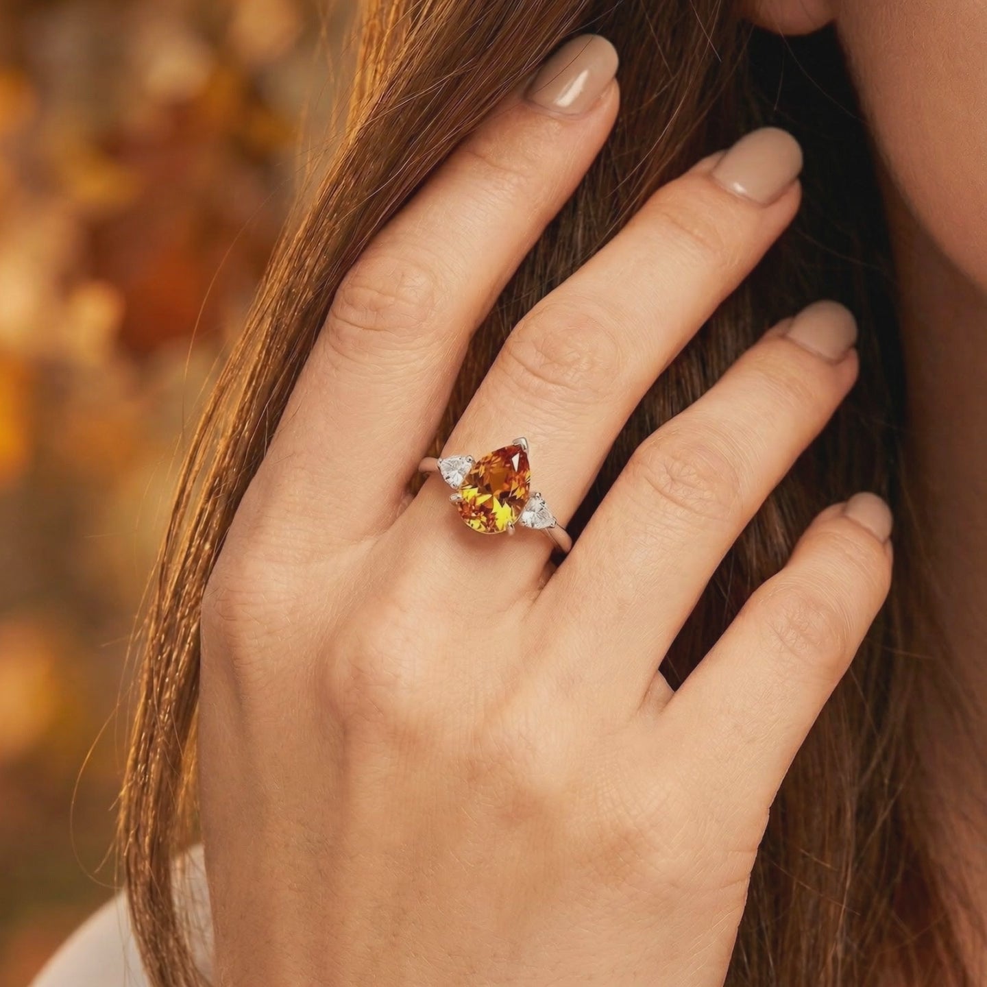 SalePear-cut honey simulated topaz ring in silver-tone metal on brown velvet with autumn leaves.