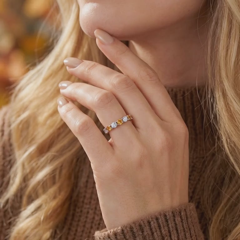 SaleNovara sterling silver half-eternity ring with round honey simulated topaz on yellow velvet with autumn leaves.