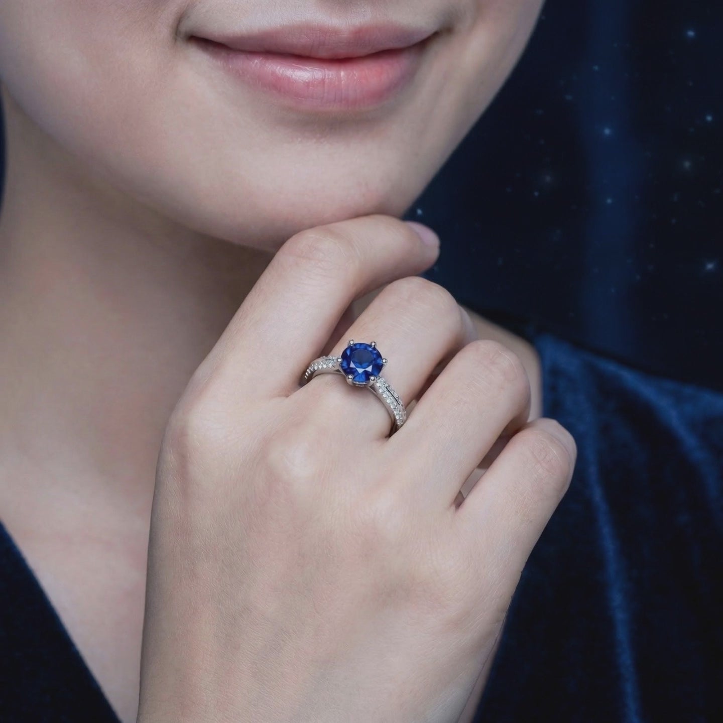 SaleRound cut simulated sapphire solitaire ring in S925 sterling silver on a dark blue velvet background.