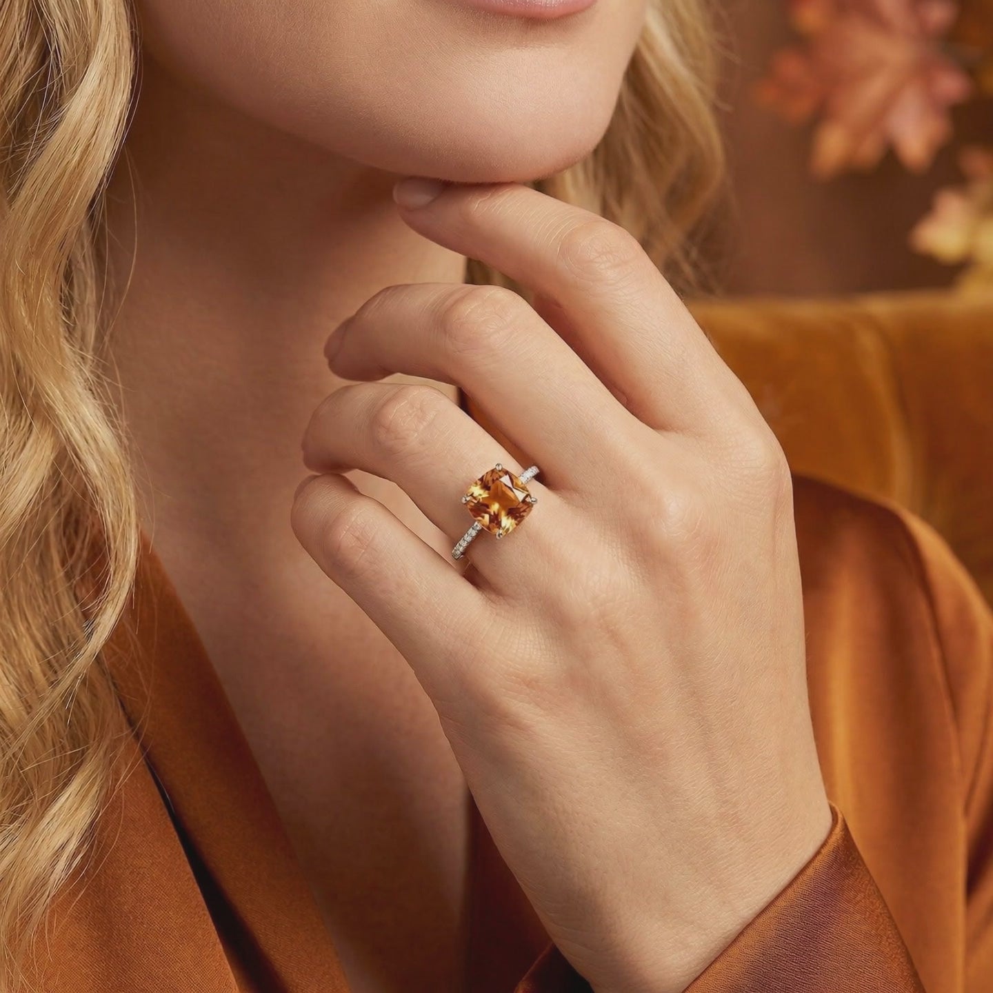 SaleEmerald-cut honey simulated topaz ring in S925 sterling silver displayed on brown velvet with autumn leaves.