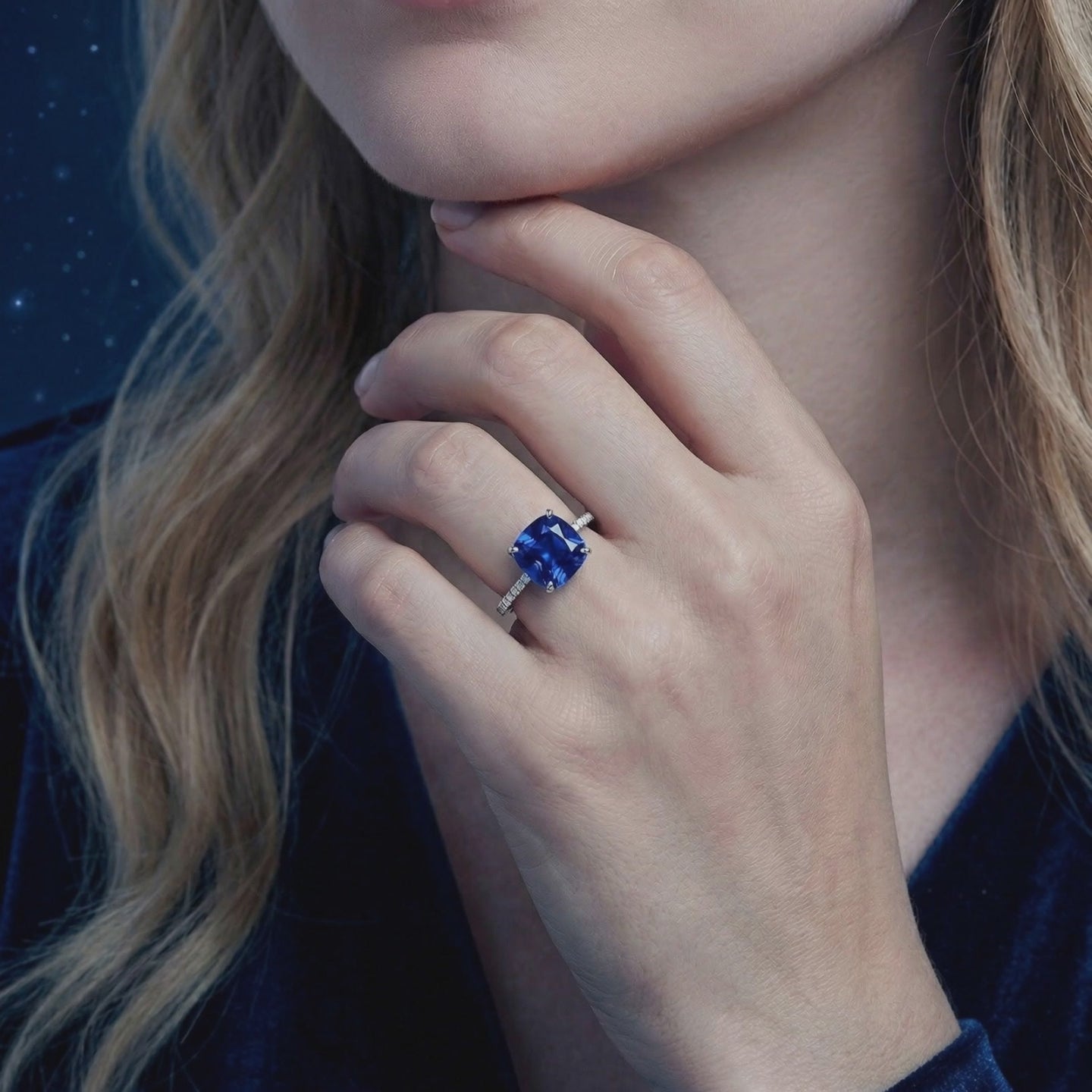 SaleCushion-cut simulated sapphire ring in S925 sterling silver on dark blue velvet with a starry background.