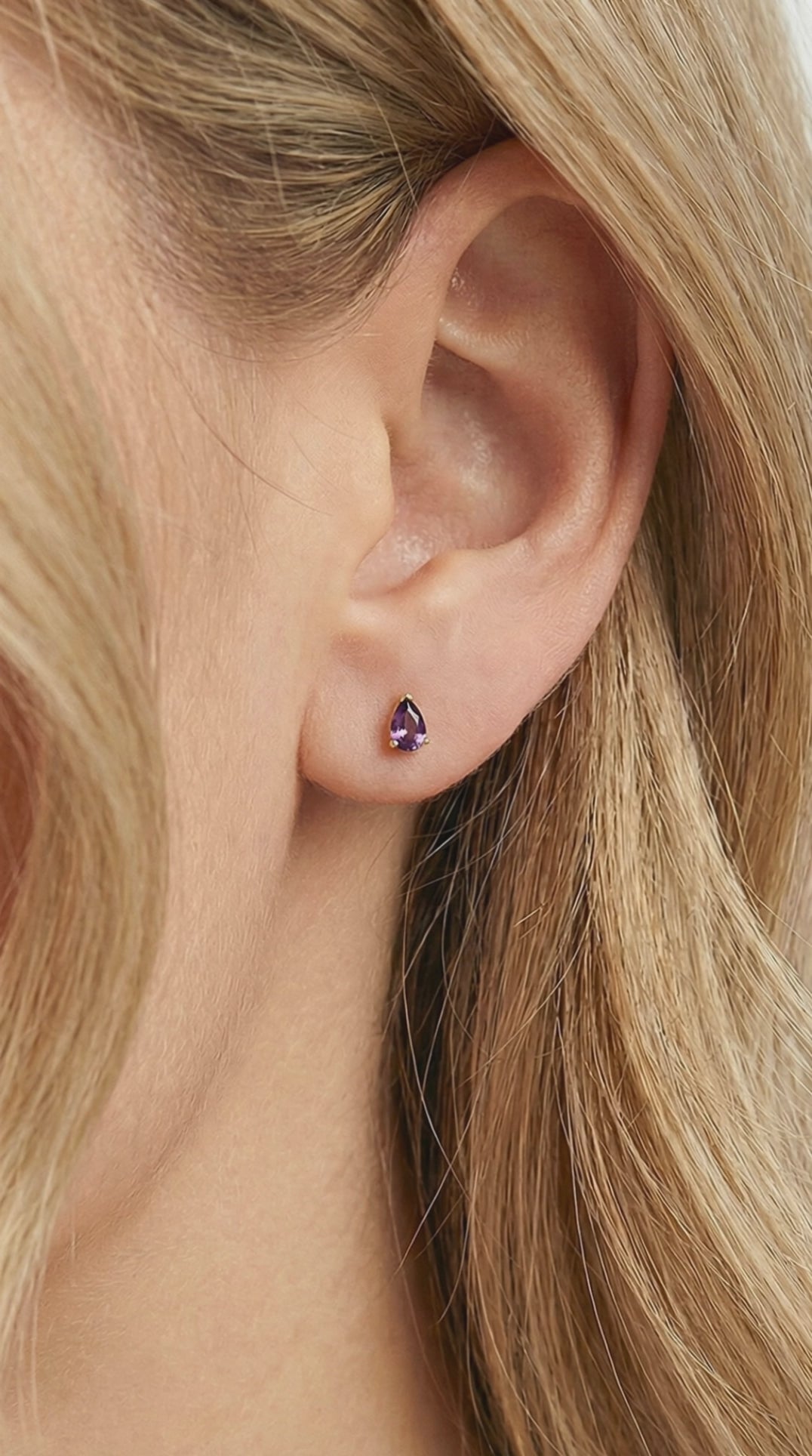 SalePurple pear cut simulated amethyst stud earrings in 18K gold vermeil with flat-back labret posts on white fabric.