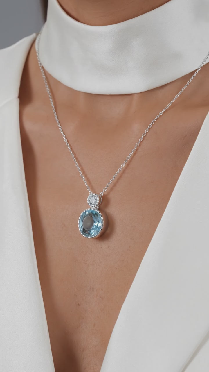 SaleRound-cut sea-water blue simulated aquamarine necklace in S925 sterling silver on blue fabric.