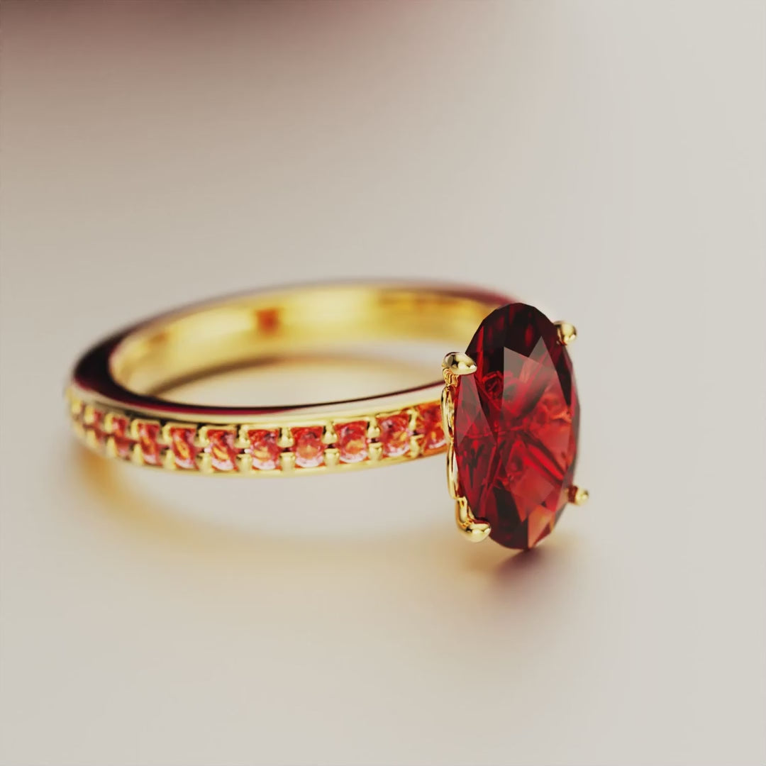 Ein oval geschliffener simulierter Rubin und ein handgefertigter und absolut atemberaubender Ring aus Vermeil-Gold. Dieses Schmuckstück ist Teil unserer Schmucklinie mit Geburtssteinen für Januar, um diejenigen von uns zu feiern, die im ersten Monat des neuen Jahres geboren sind.