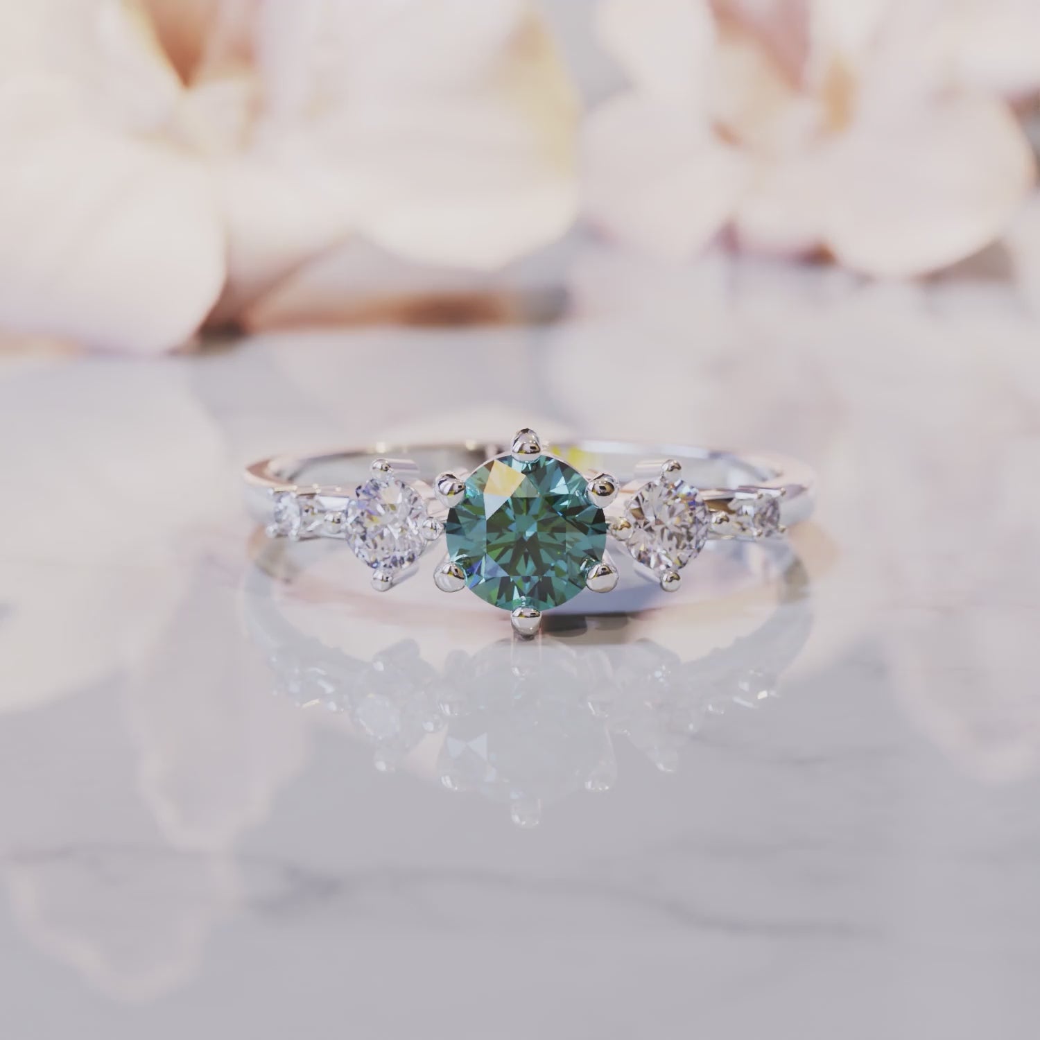 Im Zentrum dieses Rings befindet sich ein runder Alexandrit mit 0,8 Karat, ein Edelstein, der alles andere als gewöhnlich ist. Er changiert von grünlich-blau im Tageslicht zu violett und rot bei sanfter Beleuchtung – es ist, als hätte man zwei Ringe in einem! Auf beiden Seiten befinden sich zwei brillante, im Labor gezüchtete Diamanten, die diesem bedeutungsvollen Drei-Stein-Design zusätzlichen Glanz verleihen.