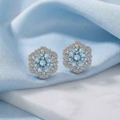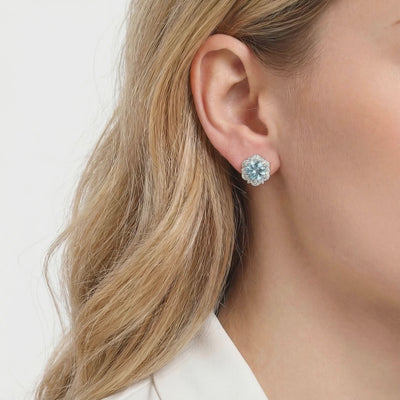 Side profile of simulated aquamarine halo stud earrings in sterling silver on a blue silk background.