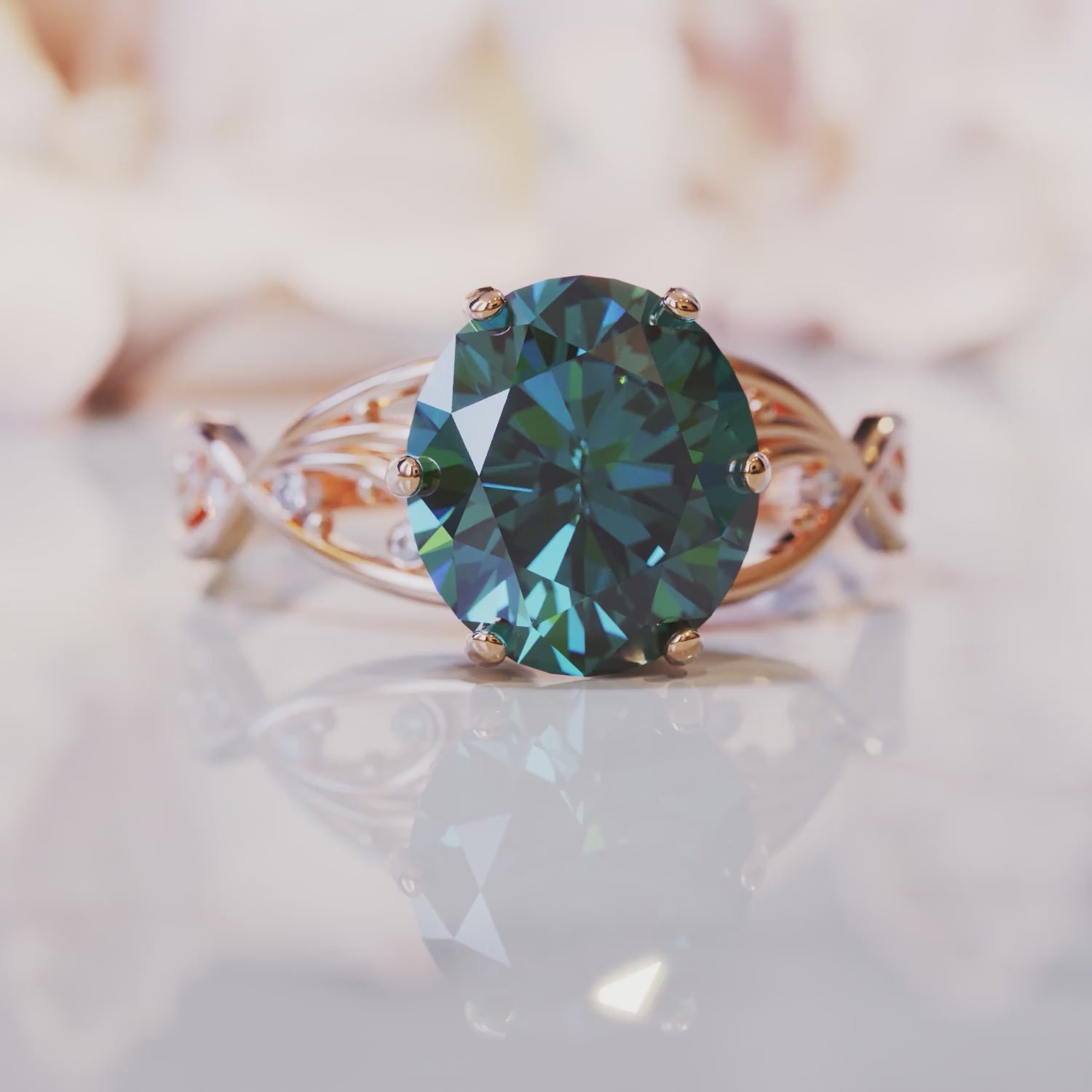 Der Alexandria-Ring besticht durch einen faszinierenden , 2,2 Karat schweren, oval geschliffenen, im Labor hergestellten Alexandrit , der für seine seltene Fähigkeit bekannt ist, je nach Tageszeit und Lichtquelle seine Farbe zu ändern. Ob schimmerndes Blaugrün im natürlichen Licht oder leuchtendes Lila in Innenräumen – dieser Stein ist pure Magie. Perfekt verarbeitet und mit makelloser Klarheit bietet er in jedem Moment atemberaubende Brillanz.