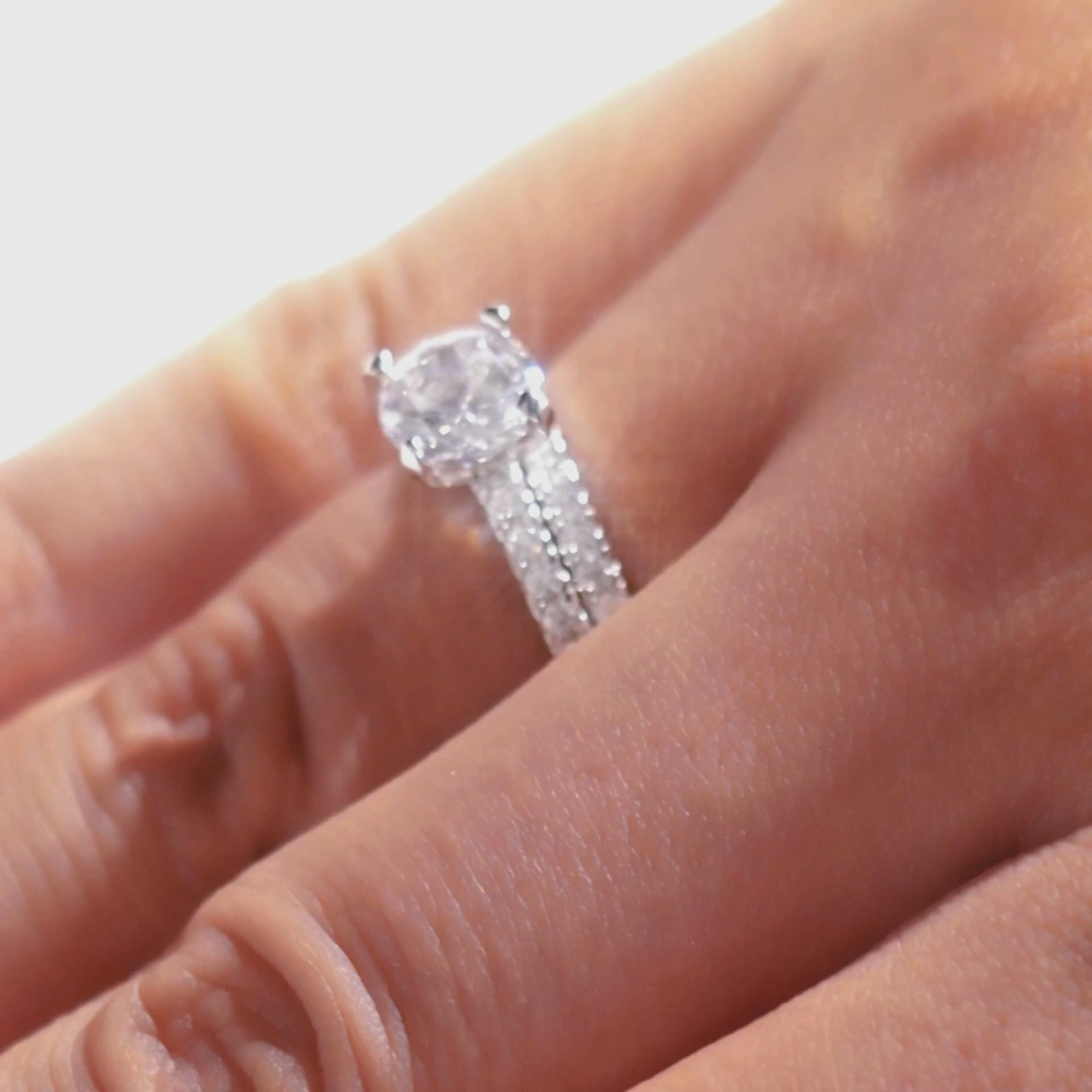 Der Engel vereint klassische Eleganz mit modernem Glanz. Dieser klassische Pavé-Eternity-Ring mit Doppelband ist aus 925er Sterlingsilber gefertigt und mit einem brillanten, runden 1-Karat-Moissanit in Krappenfassung versehen. Das Band ist mit schimmernden Labordiamanten besetzt, die aus jedem Blickwinkel funkeln.