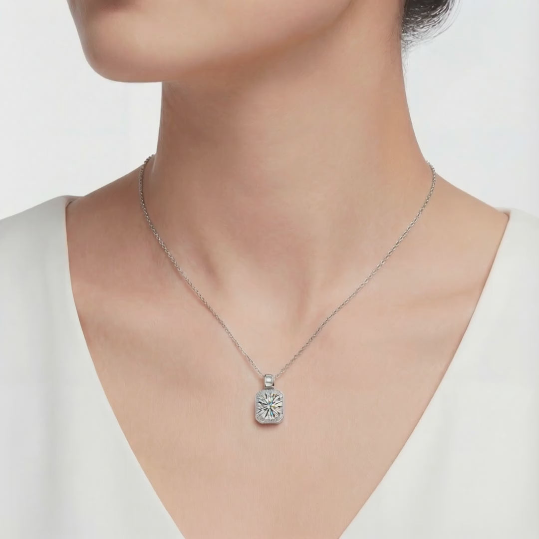 The emerald-cut silhouette is framed by a precision-calibrated halo, designed to maximize light return and provide the visual impact of a museum-grade heirloom. Every stone is set in Solid 925 Sterling Silver and finished with Rhodium for platinum-level tarnish resistance.