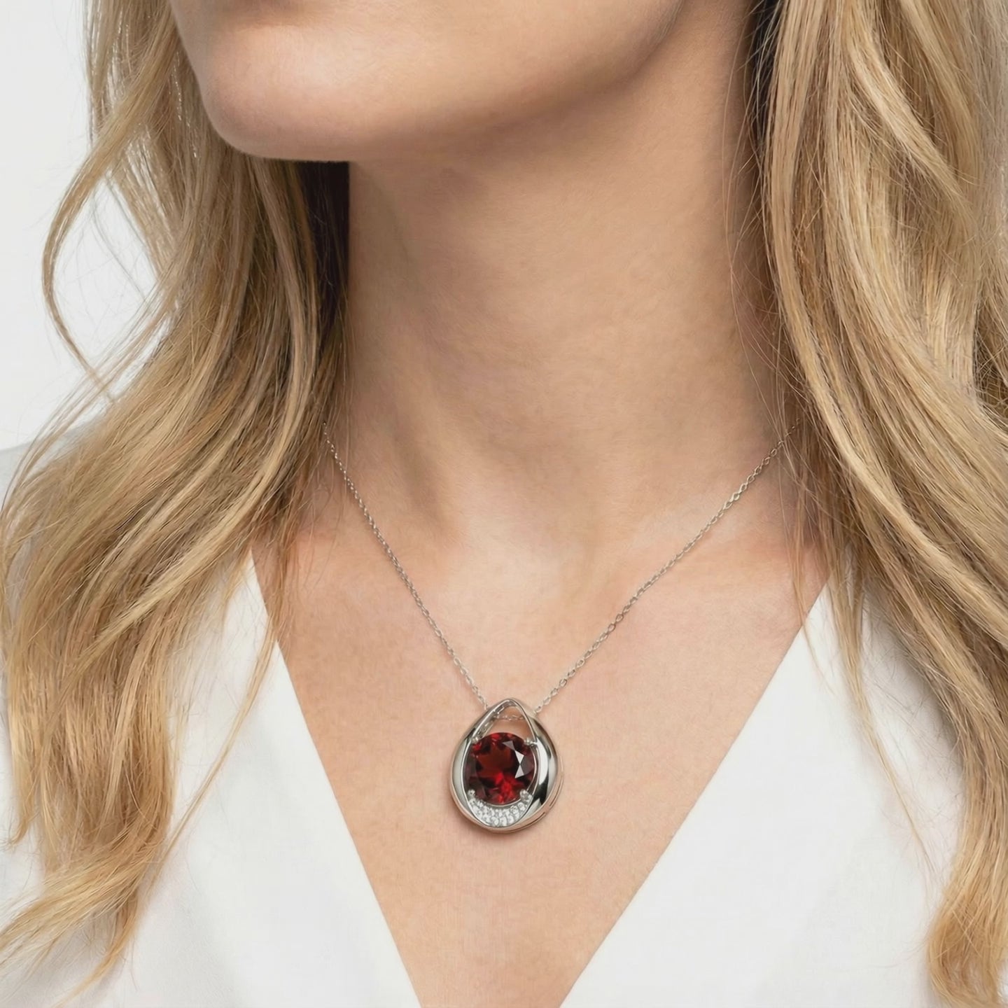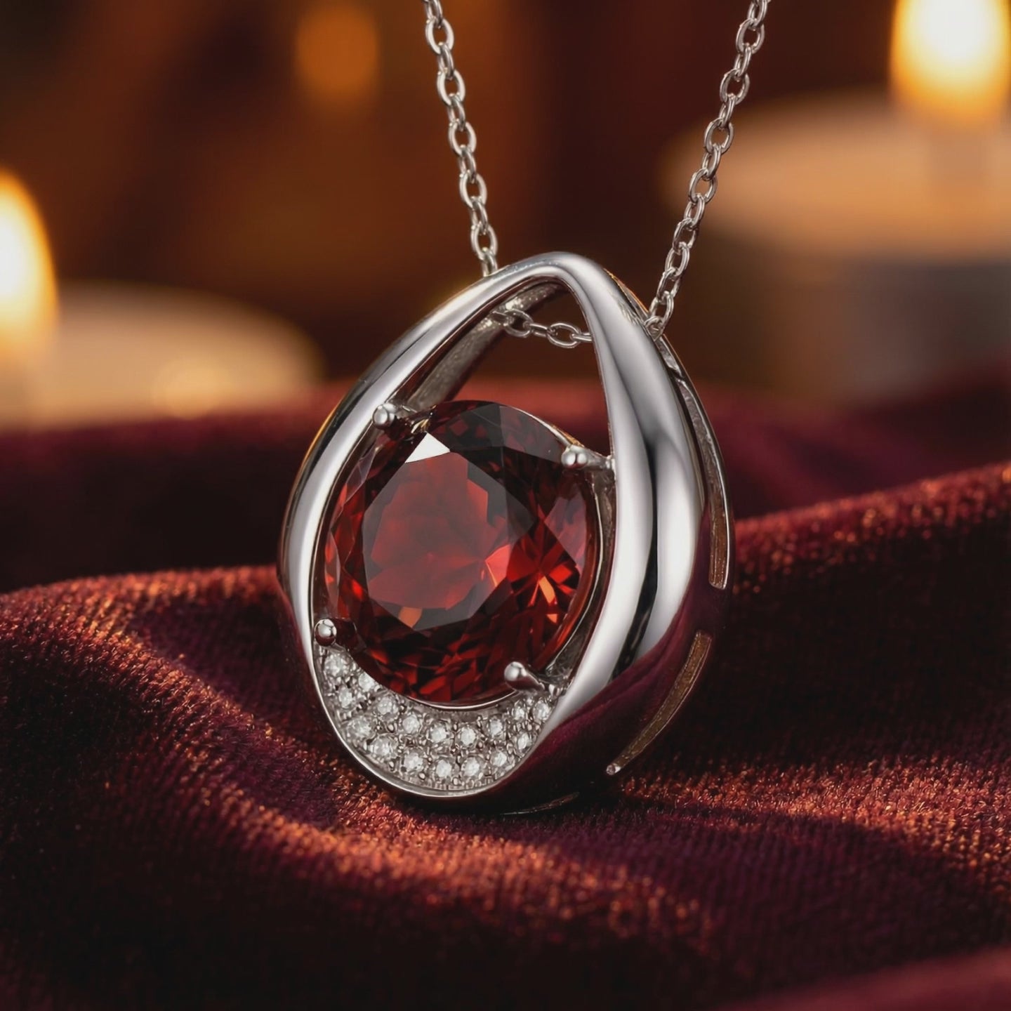Mined garnets are frequently clouded by inclusions and inconsistent color. This simulated garnet necklace is engineered to achieve the coveted "Bohemian Red" benchmark—a deep, royal crimson that remains consistent across every stone. Precision-cut from A5 Grade material, the center stone is calibrated for maximum light return and set within a protective teardrop halo of brilliant accents.