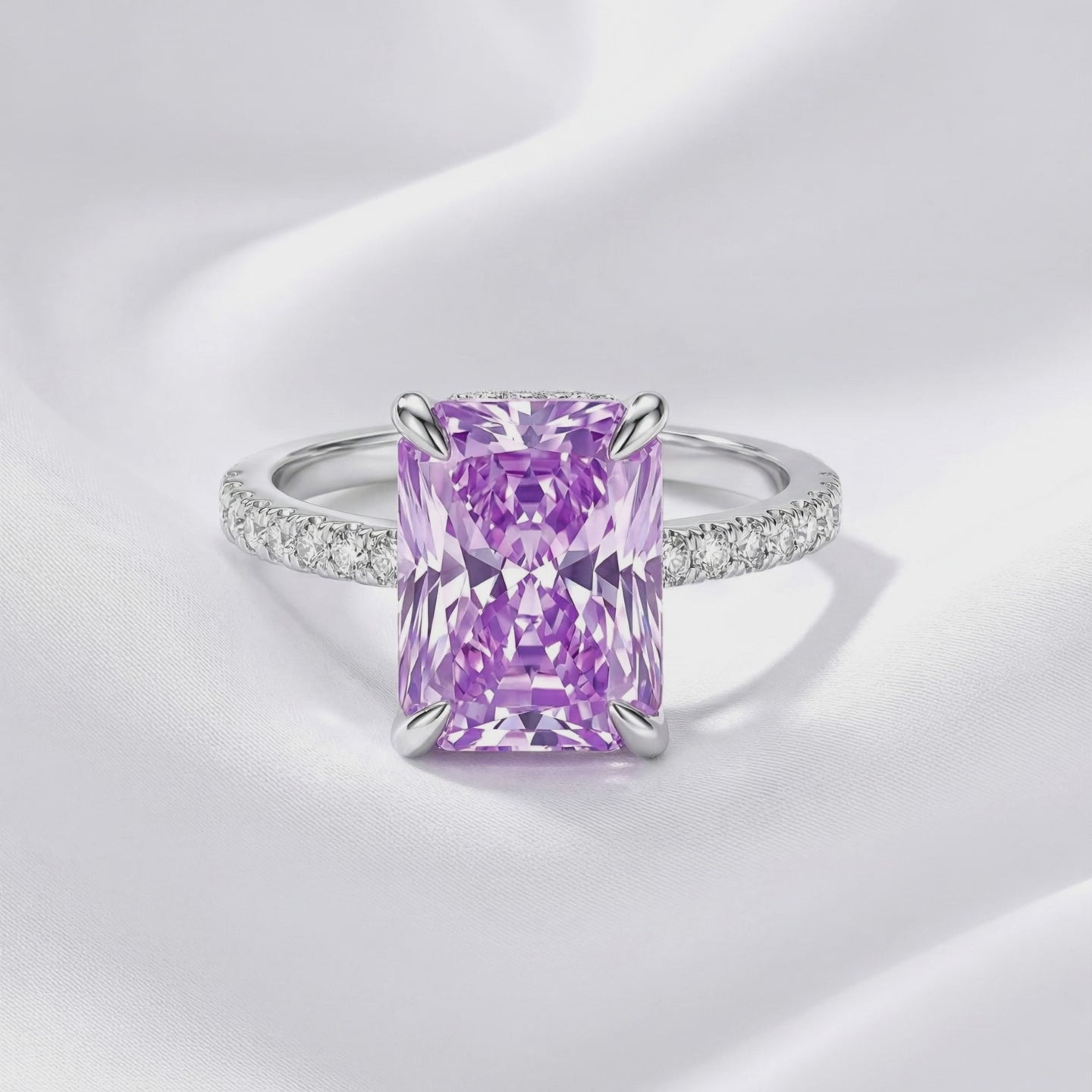 Close-up of a radiant cut purple simulated amethyst ring with a pavé S925 sterling silver band.