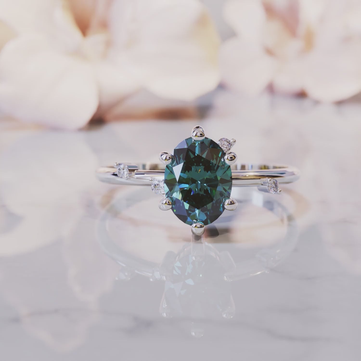 Der ovale Schliff verleiht dem Alexandrit die perfekte Balance aus Funkeln und Eleganz. Der Ring wird sicher von einer klassischen 6-Krappen-Fassung gehalten und ist ebenso langlebig wie schön. Das Band ist mit hochwertigen, im Labor gezüchteten Alexandrit-Edelsteinen besetzt, die ethisch einwandfrei gewonnen wurden und für einen schuldenfreien Glanz sorgen.