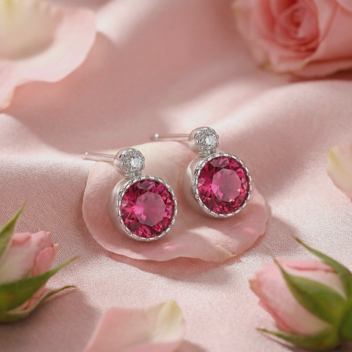 Stainless steel tennis bracelet with round-cut simulated pink tourmaline stones on pink satin and rose petals.