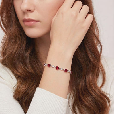 Mined rubies are often cloudy, brown, and inconsistently matched. This July birthstone bracelet features Simulated Ruby, engineered to match the coveted "Pigeon Blood" red benchmark. Each oval-cut stone is color-calibrated for maximum light return and flawless saturation, delivering the visual physics of a museum-grade heirloom without the scarcity tax.