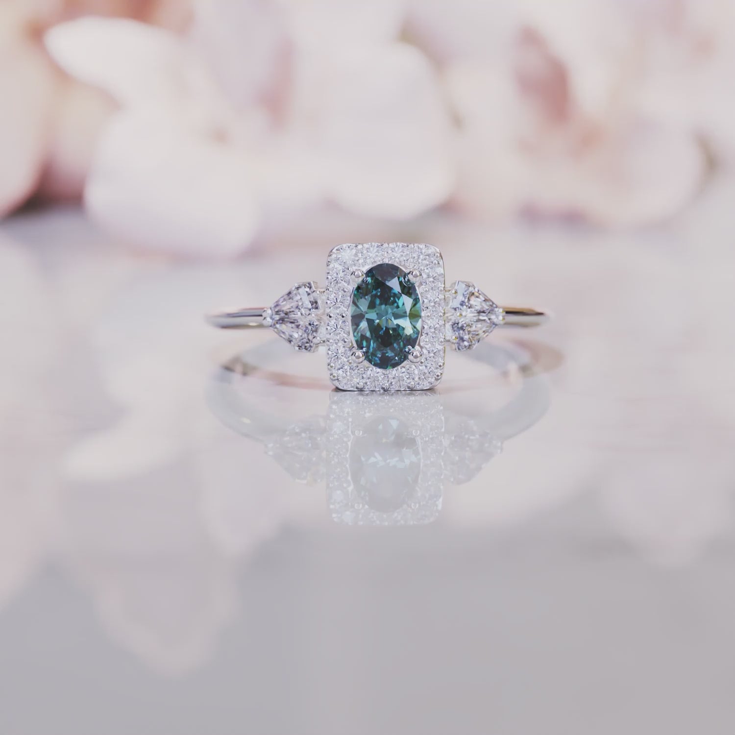 Lernen Sie den Inara kennen, einen modernen Alexandritring, der mit seinem farbwechselnden Glanz und seinem raffinierten Stil glänzt. Mit einem 0,8-karätigen Alexandrit im Ovalschliff, umgeben von einem Kranz aus simulierten Diamanten, ist dieser Ring die perfekte Wahl für Verlobungen, Jubiläen oder den Alltag.