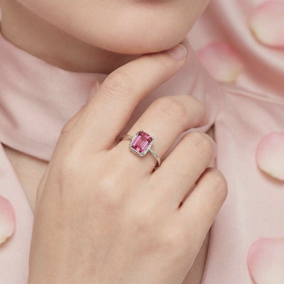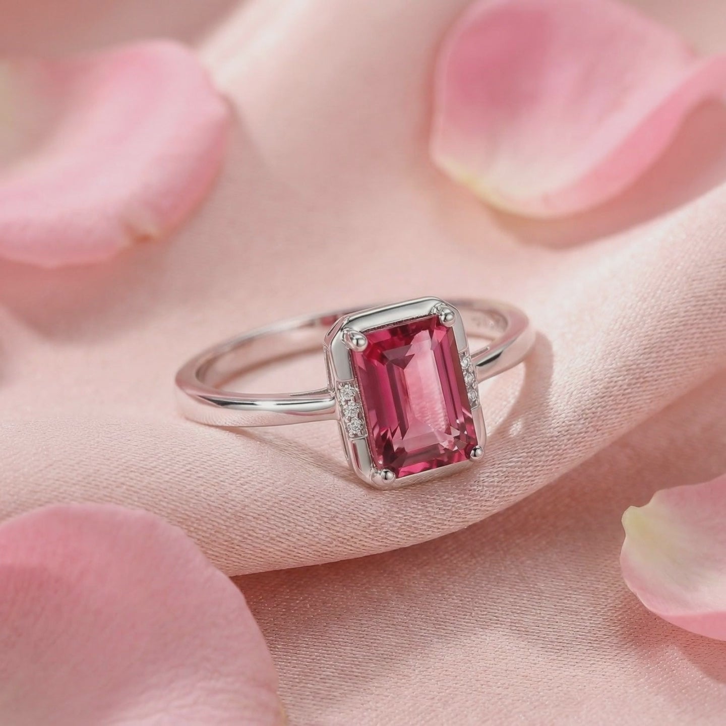 Macro view of an emerald-cut pink tourmaline ring in sterling silver showing detailed facets and side stones.