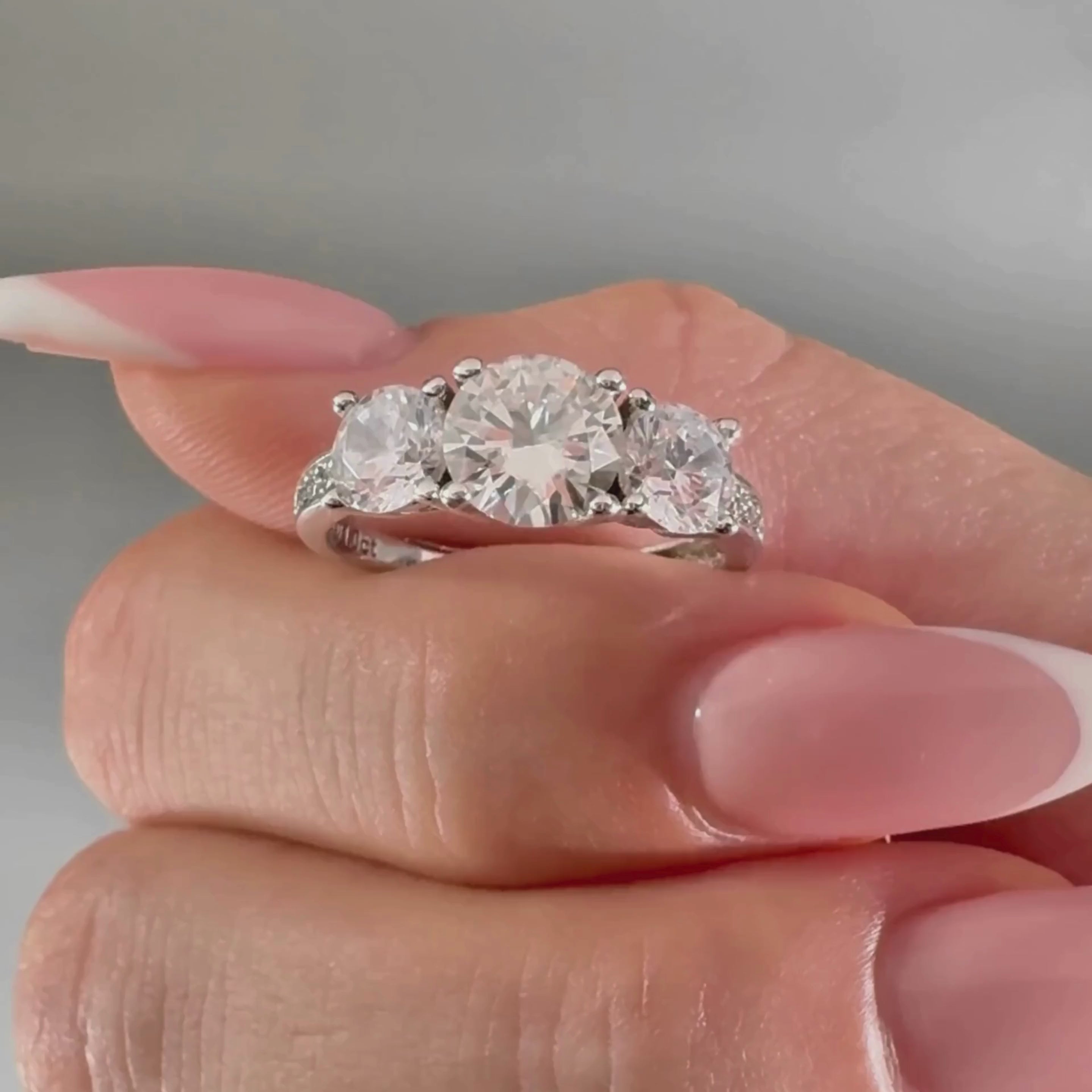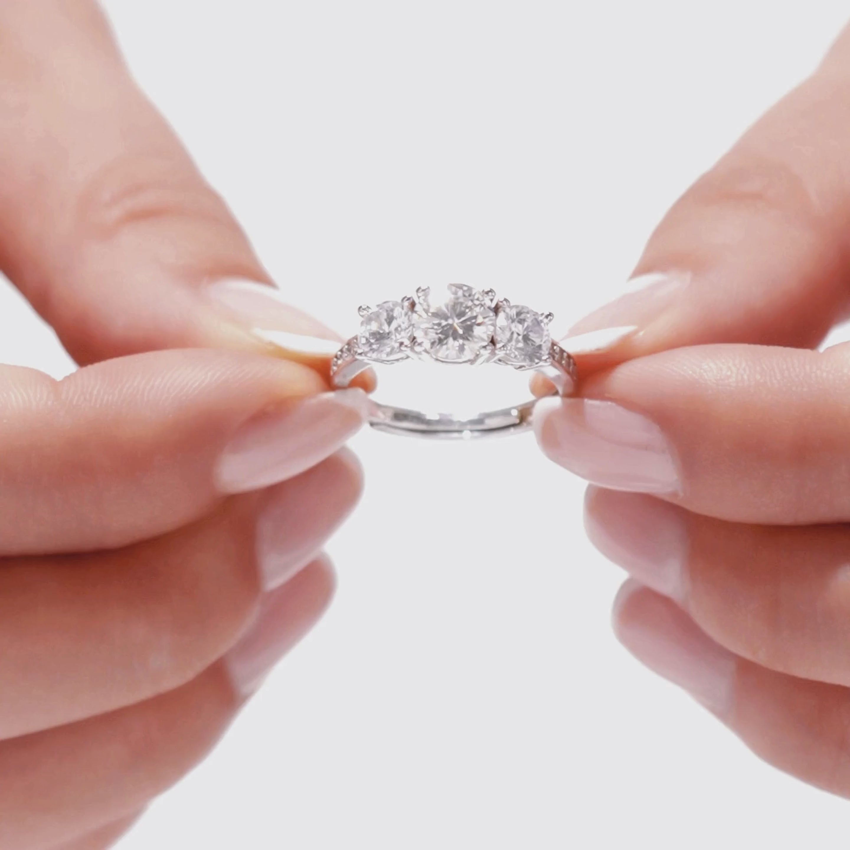 Im Zentrum befindet sich ein funkelnder Moissanit-Edelstein, flankiert von zwei kleineren Akzentsteinen für zusätzlichen Glanz. Der Halb-Ewigkeitsring mit weiteren Moissanit-Steinen verleiht ihm einen Hauch von Charme. Perfekt für Verlobungen, besondere Anlässe oder einfach, um sich selbst etwas Gutes zu tun.