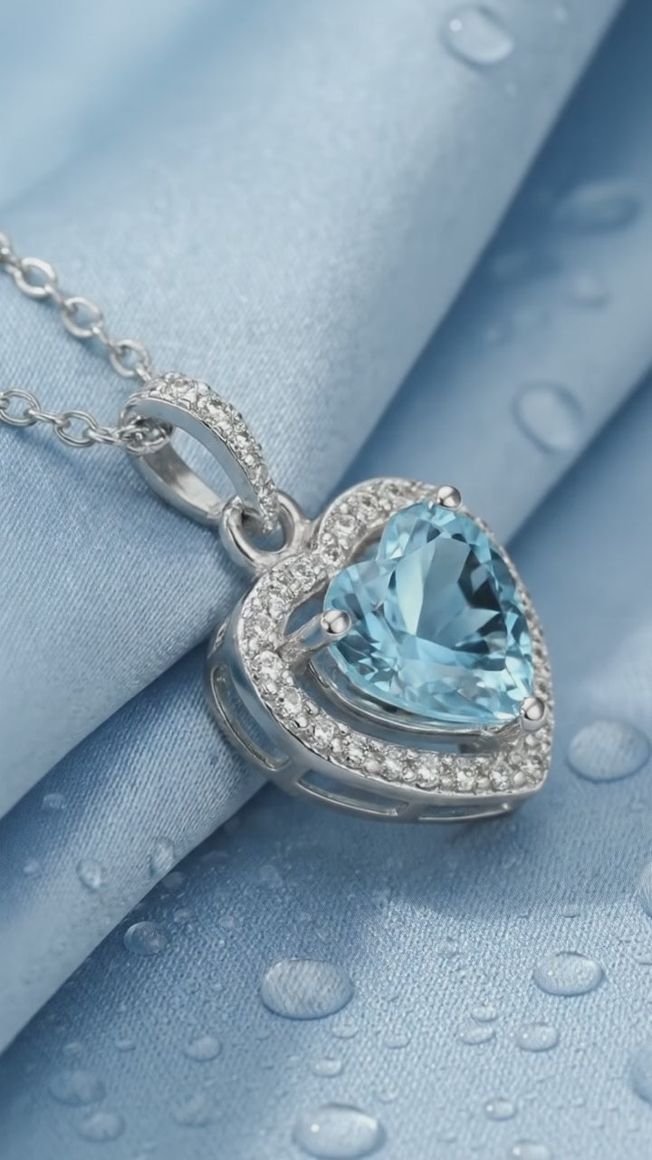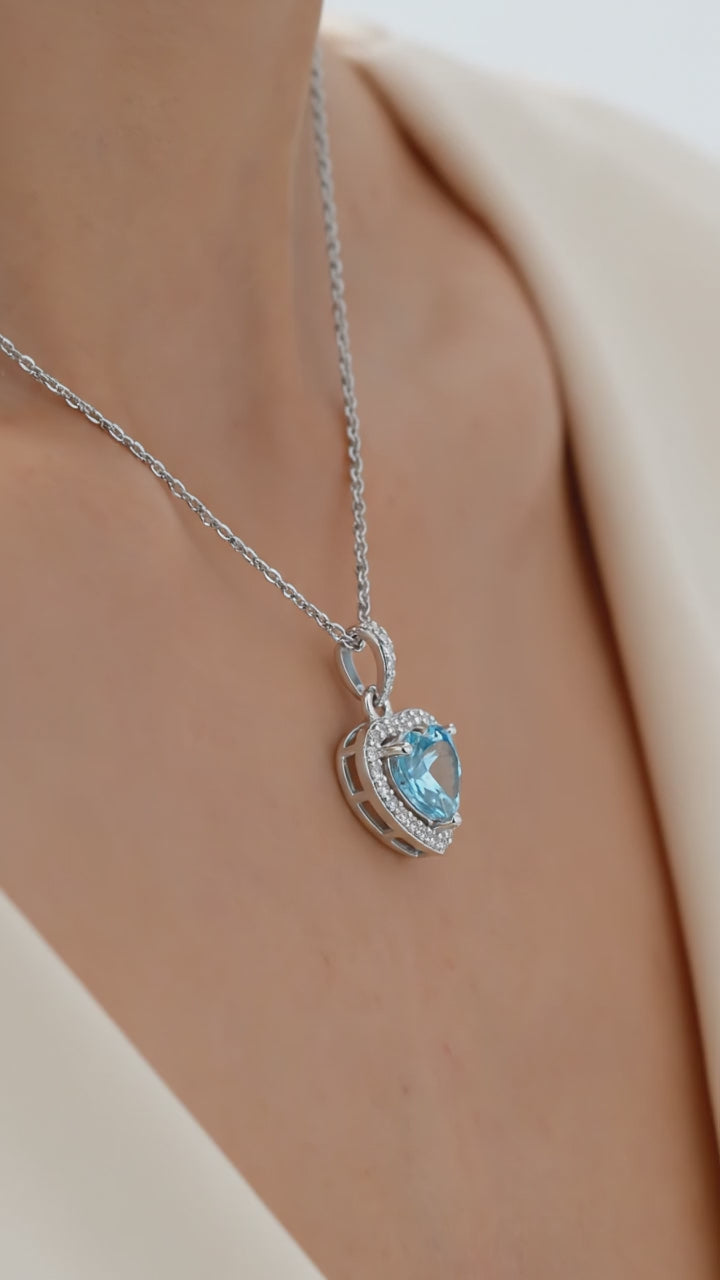 Woman wearing the Nerissa heart cut simulated aquamarine pendant necklace in sterling silver.