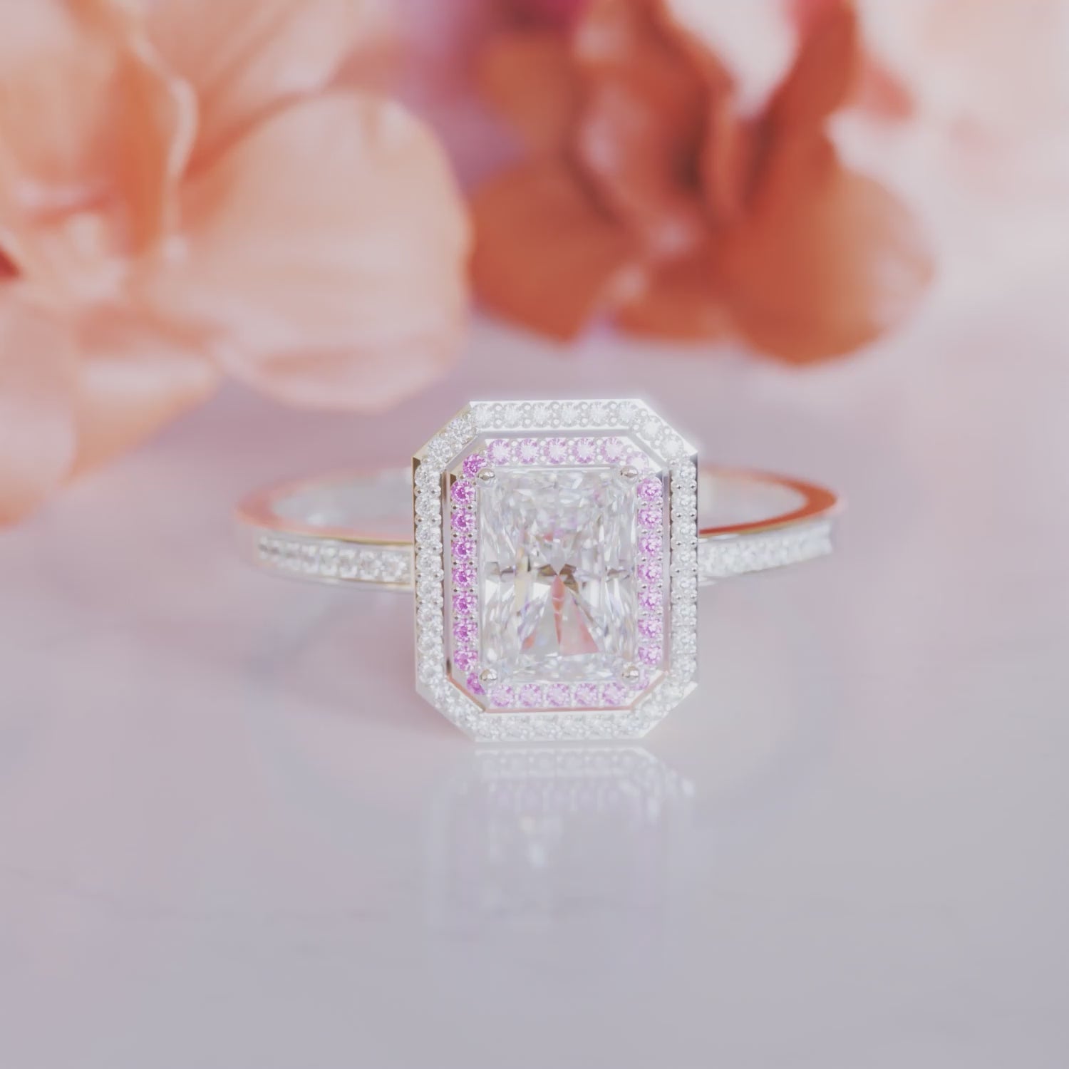 Beim Radiant geht es nicht nur um den atemberaubenden Mittelstein. Er besteht aus einer ganzen Schar rosa und weißer simulierter Diamanten, die einen Heiligenschein bilden, das Licht einfangen und aus jedem Winkel funkeln.