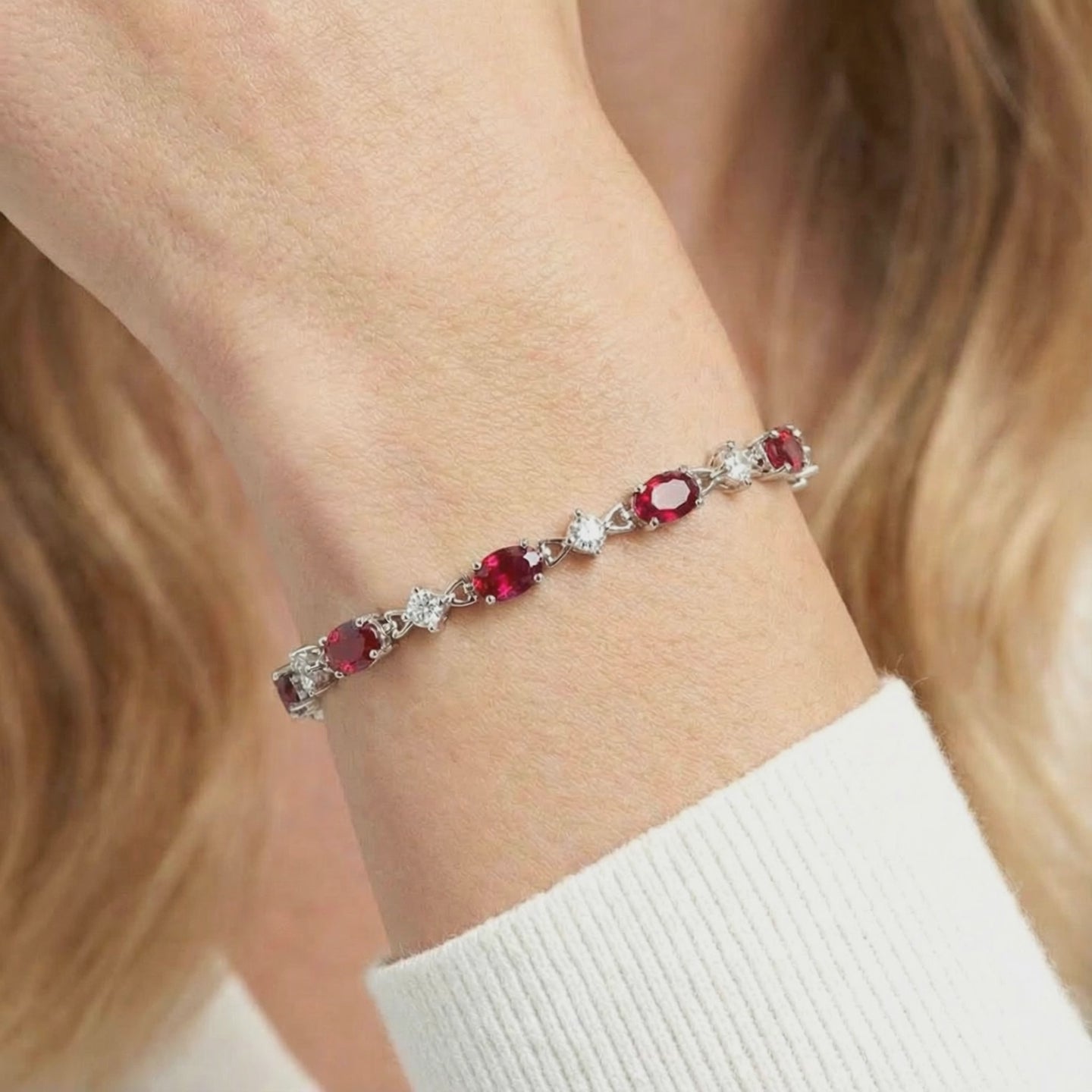 Mined rubies are notoriously difficult to source without significant inclusions or brownish undertones. This July birthstone bracelet features Simulated Ruby, engineered to hit the coveted “Pigeon Blood” red benchmark with absolute consistency. Every stone is color-calibrated for high-saturation fire and museum-grade clarity.