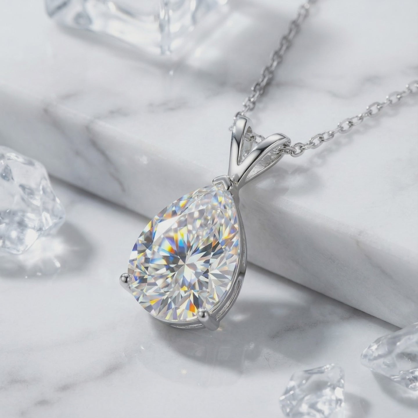 Close-up of a 1.5CT pear-cut moissanite pendant in a silver V-bale setting, showing brilliant light refraction.