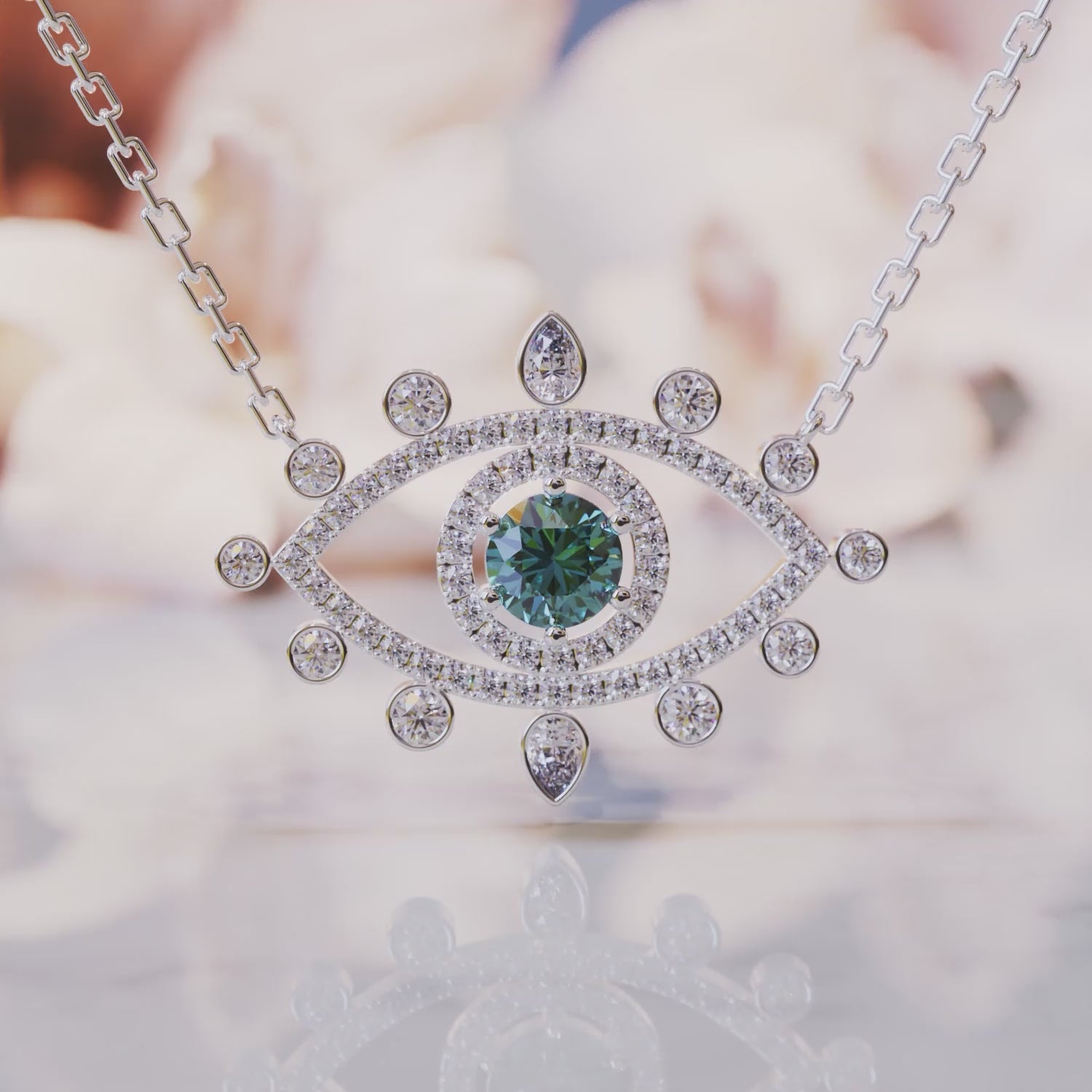 Die Teresa Alexandrit-Halskette besticht durch einen atemberaubenden 0,8 Karat schweren Alexandrit im Rundschliff, der für seine faszinierenden Farbwechsel bekannt ist. Dieser hochwertige, makellose Edelstein ist von einem einzigartigen „Böser-Auge“-Design umgeben, das durch makellose, im Labor gezüchtete Diamant-Imitationen für einen schimmernden Halo-Effekt akzentuiert wird.
