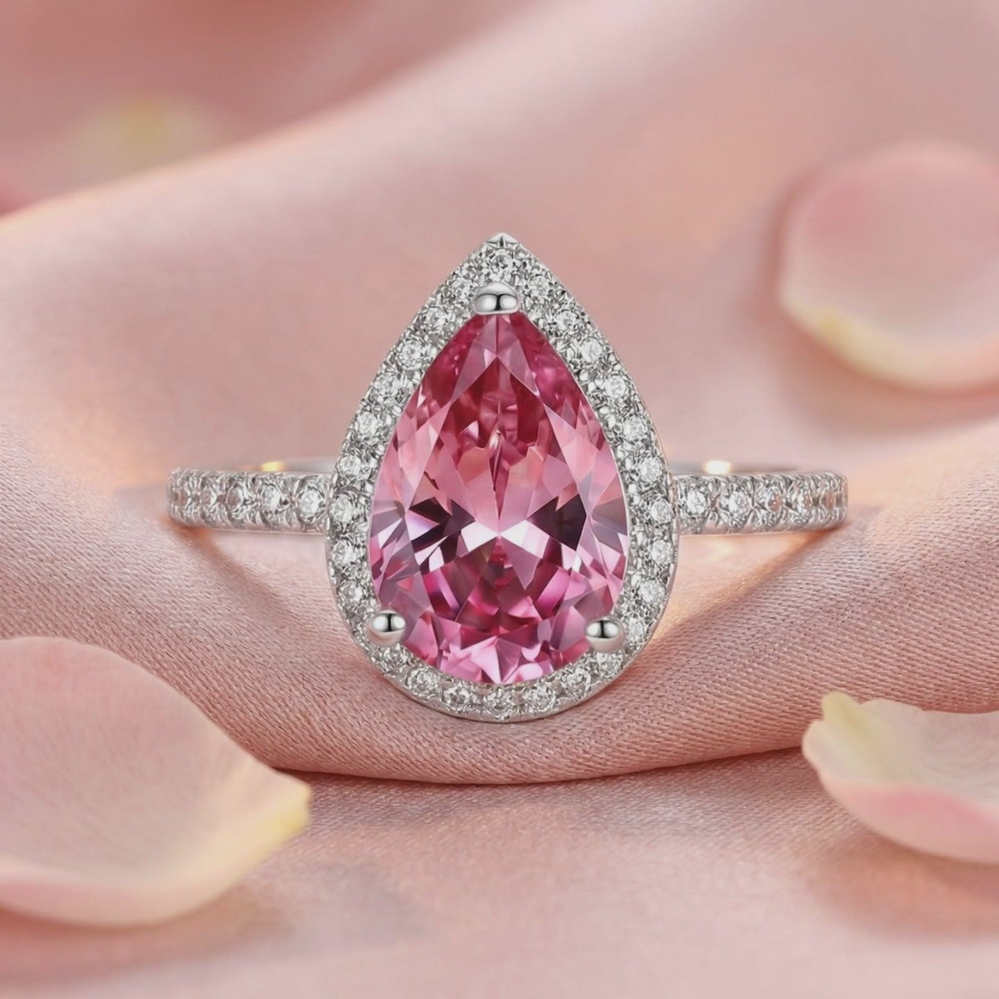 Angled view of the Valerienne pear-cut pink tourmaline halo ring in sterling silver on pink fabric.