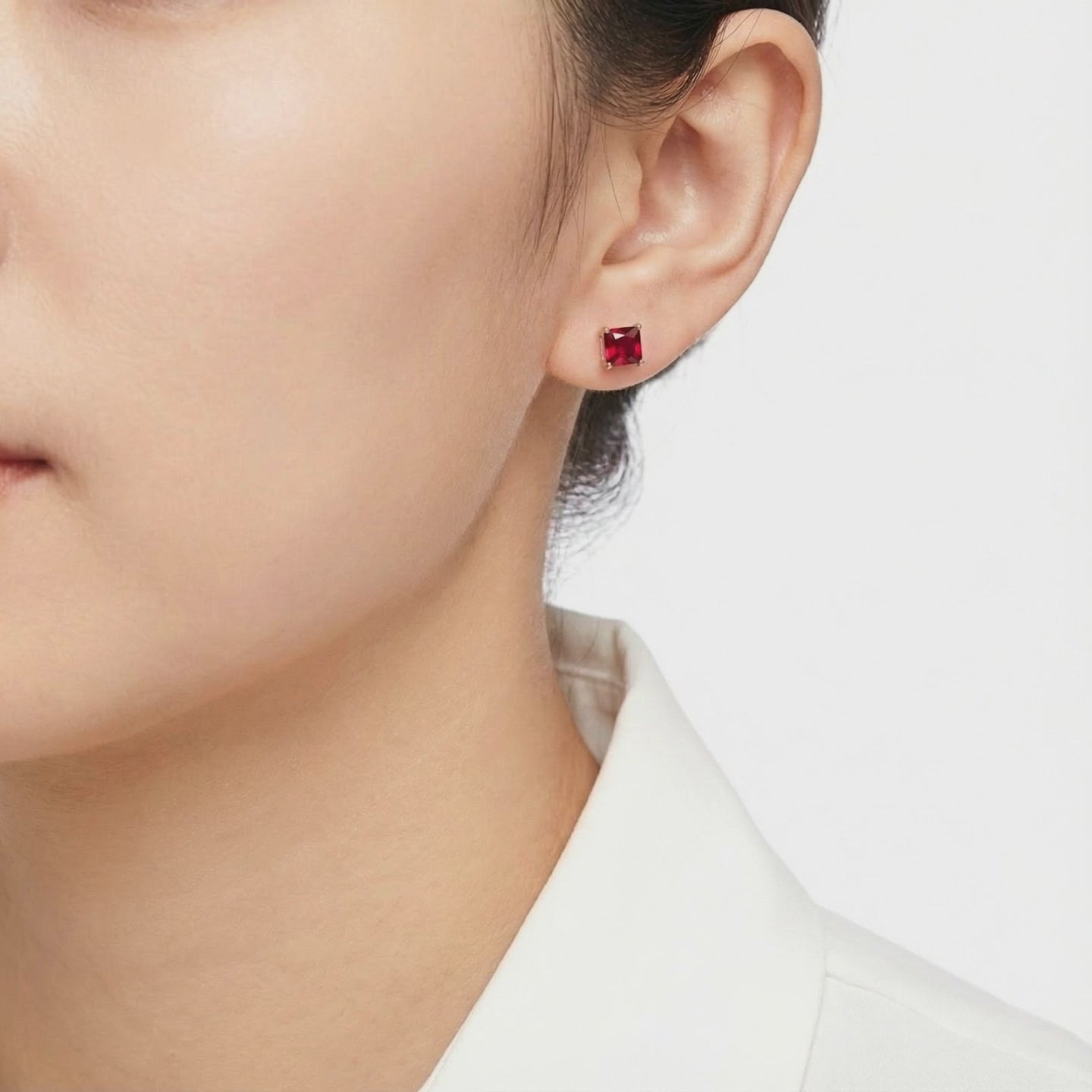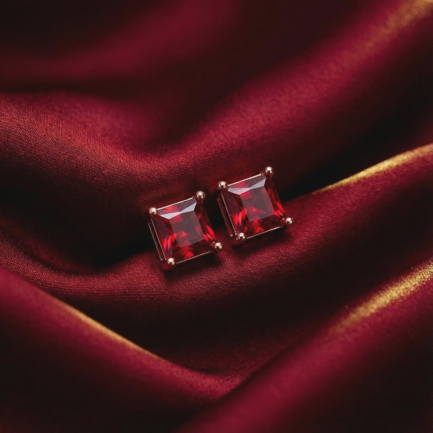 Macro view of square pigeon blood simulated ruby stud earrings in 18K rose gold vermeil settings.