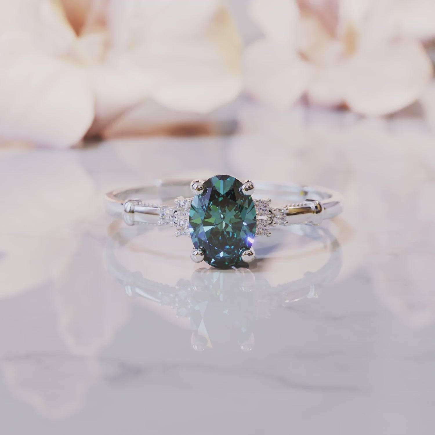 Im Mittelpunkt dieses wunderschönen Designs steht ein 1-karätiger Alexandrit im Ovalschliff, ein Edelstein, der für seine magischen Farbwechsel bekannt ist. Im Sonnenlicht schimmert er in leuchtenden Grün- und Blautönen, und am Abend verwandelt er sich in satte Lila- und Rottöne. Es ist, als ob man ein kleines Stück Zauber überallhin mitnimmt.