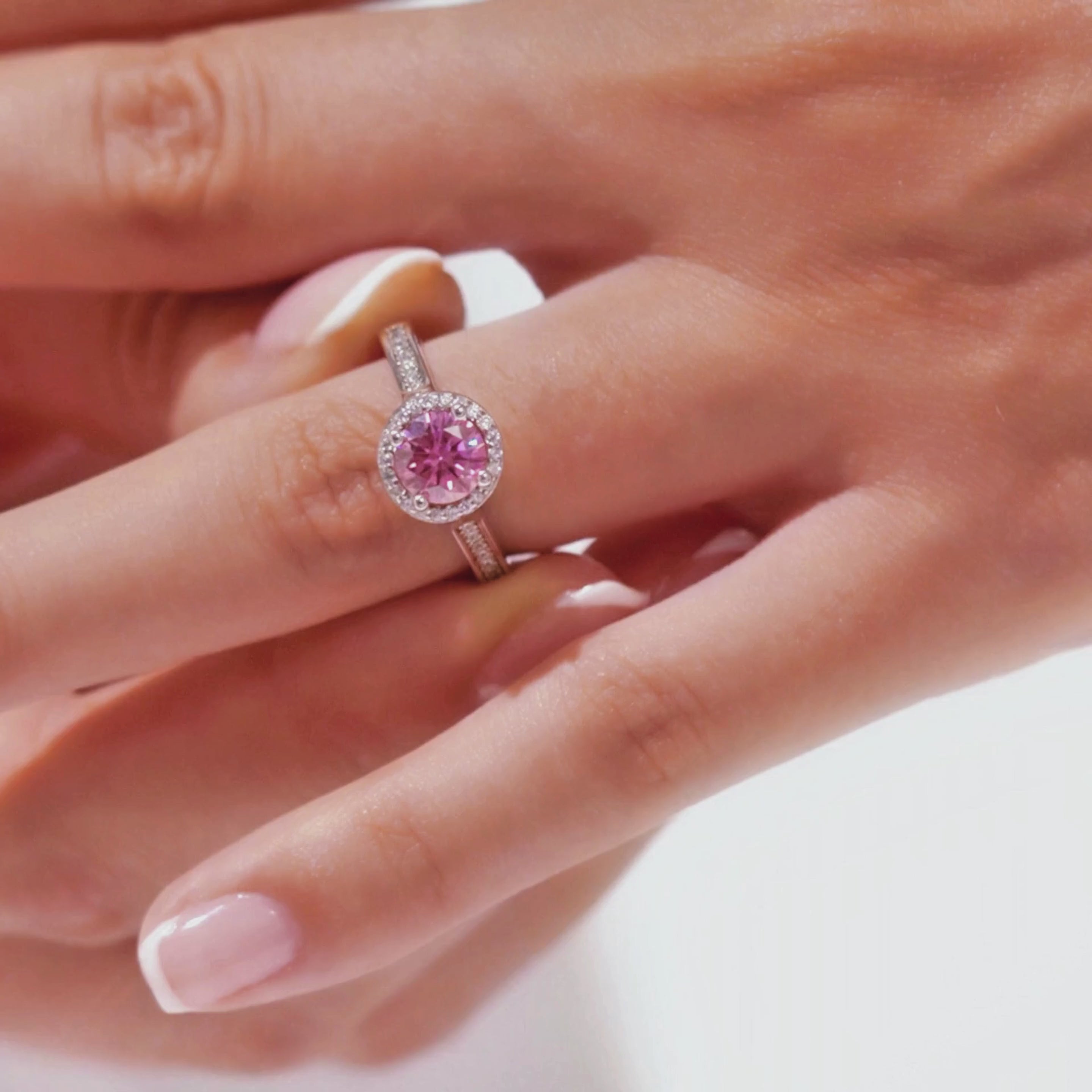 Der Venus ist ein atemberaubender, runder rosa Moissanitring, der Romantik und Eleganz ausstrahlt. In einer klassischen Krappenfassung mit zartem Halo besticht der Stein durch seine schillernde Brillanz und seinen Charme und symbolisiert Liebe und Raffinesse.