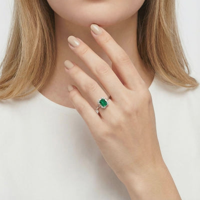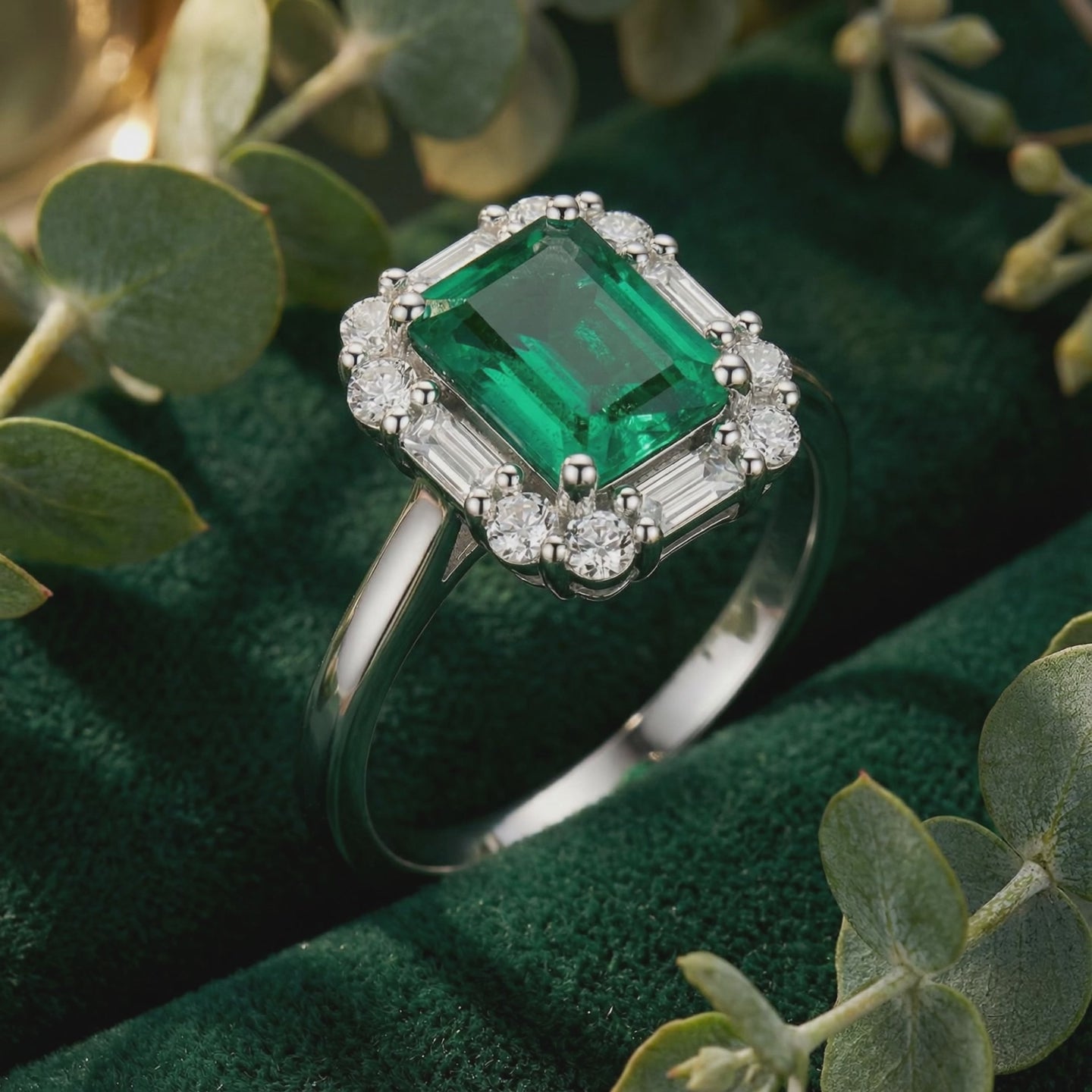 Mined emeralds are notoriously brittle and often clouded by heavy inclusions. This ring features a high-performance Simulated Emerald, engineered to match the coveted deep green saturation of the world’s finest museum-grade stones. Precision-cut in a classic octagon silhouette to maximize light return and color intensity.