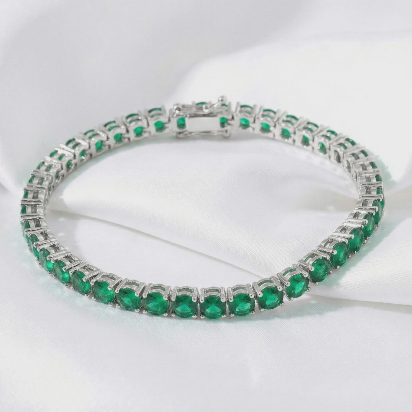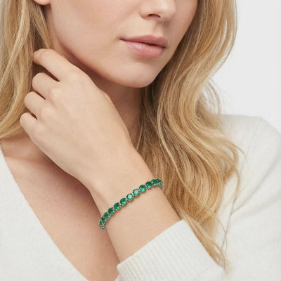 Close-up of a stainless steel tennis bracelet with forest green simulated emeralds on green velvet.