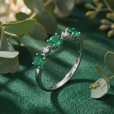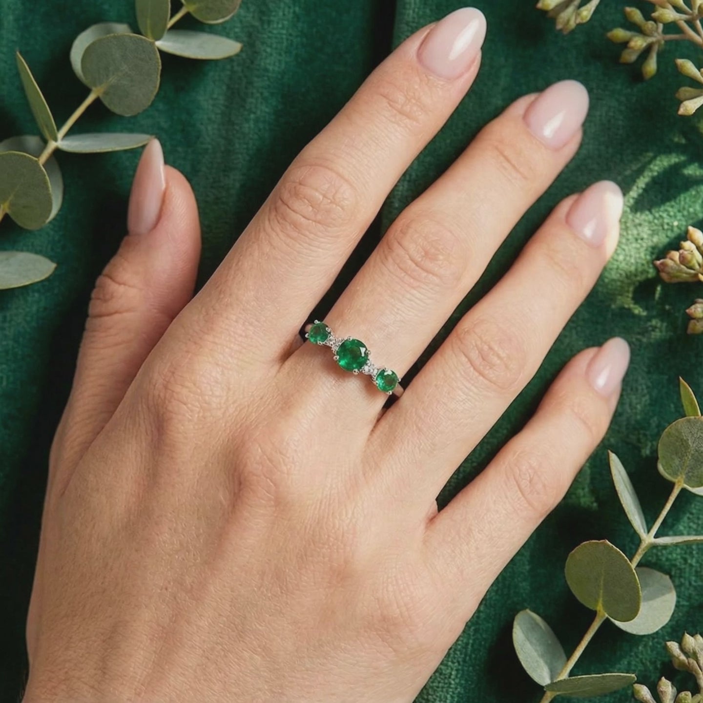 Nature rarely delivers a flawless emerald without cloudy inclusions or internal cracks. We engineered it to be perfect. This May birthstone ring features three color-calibrated simulated emeralds, capturing the deep forest-green saturation found in the world's most coveted museum-grade stones.
