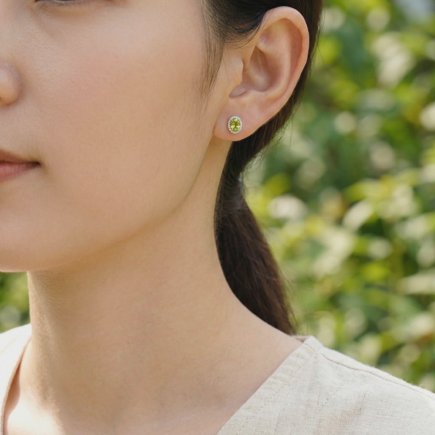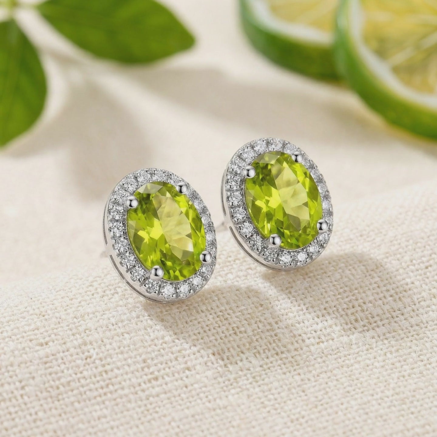 Close-up of oval peridot halo stud earrings in sterling silver showing the side basket setting and butterfly back.