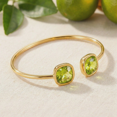 Mined peridot often lacks the vivid intensity sought after in museum-grade jewelry. We engineered The Zelina Bangle to solve for color inconsistency. This bracelet features two precision-cut Simulated Peridots, color-calibrated to achieve a vibrant yellow-green brilliance with flawless clarity. Unlike natural stones that are often cloudy, these gems deliver maximum light return from every angle.