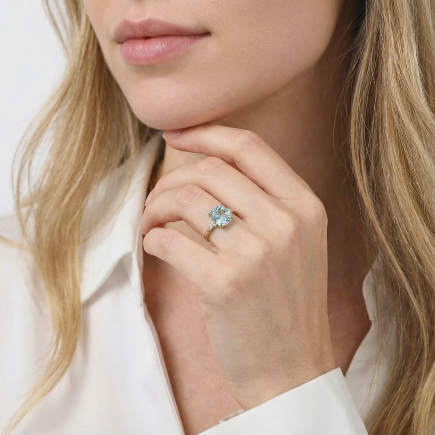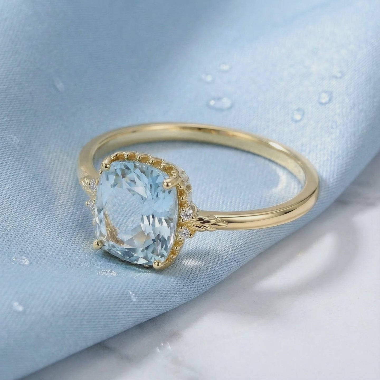 - Stone: A5 Grade Simulated Aquamarine (Cushion Cut)