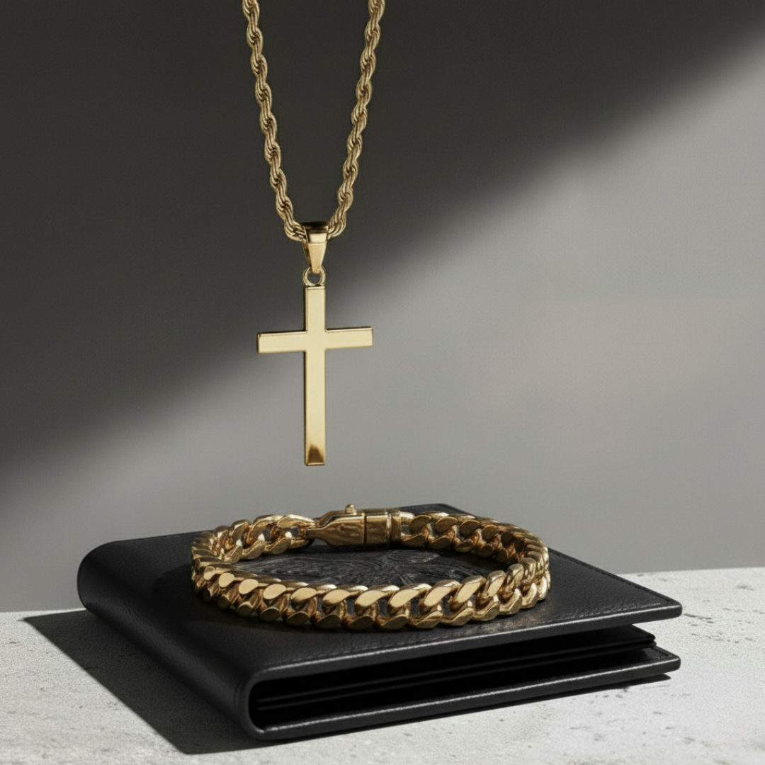 Inside: A complete set of gold jewelry (Cuban link bracelet, cross necklace, rope chain), a premium leather wallet, and a personalized "Love You Forever" message card, all coordinated, all meaningful, all ready to gift.