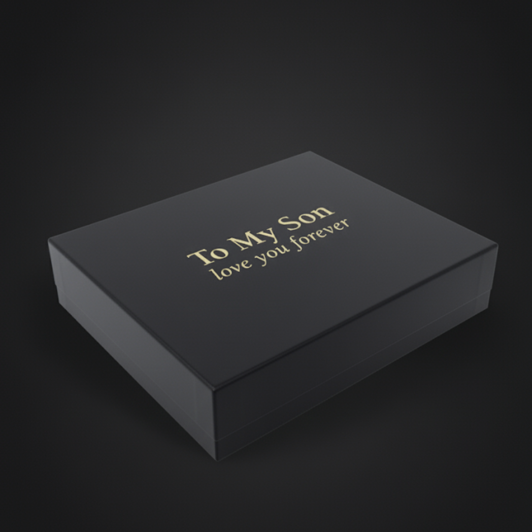He's sitting across from you. You hand him the sleek black box embossed with gold foil: "To My Son, love you forever."