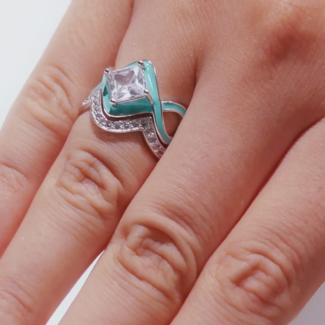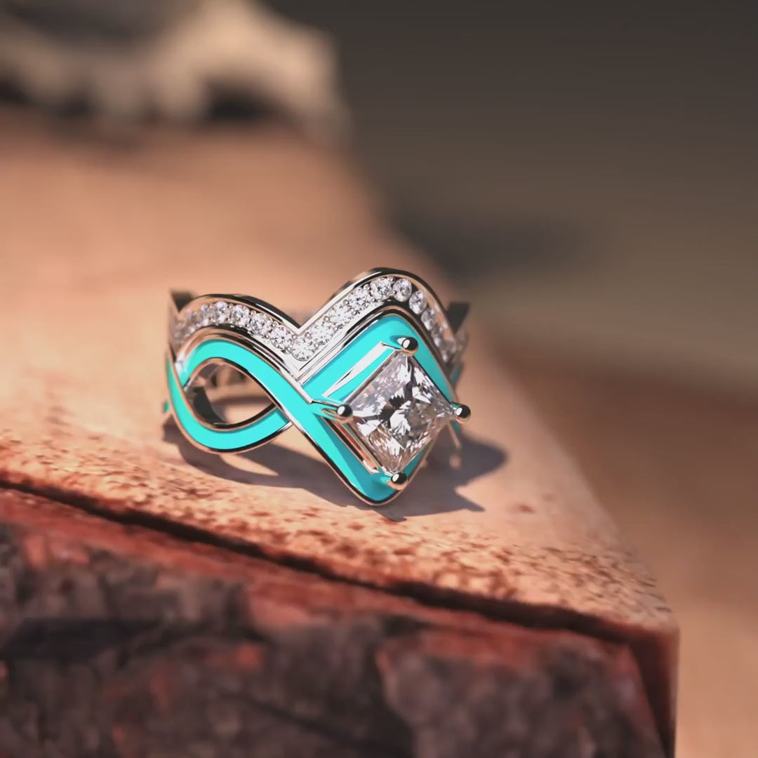 Dieses atemberaubende zweiteilige Stapelset besticht durch einen schillernden 1,5-Karat-Labordiamanten im Prinzessschliff, der für strahlende Brillanz sorgt. Der Hauptring ist mit aufwendigen türkisfarbenen Emaille-Details eingefasst, während der dazugehörige Chevron-Ring mit funkelnden Akzenten verziert ist, was ein markantes und zugleich elegantes Design schafft.