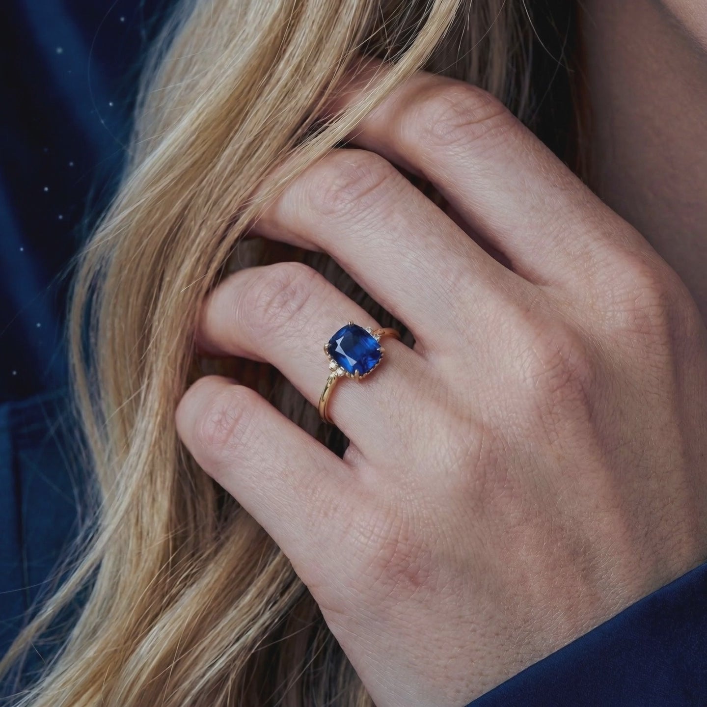 PromoCushion-cut simulated sapphire ring in S925 sterling silver on dark blue velvet with a starry background.Close-up of a cushion-cut blue simulated sapphire in a milgrain sterling silver setting on blue velvet.