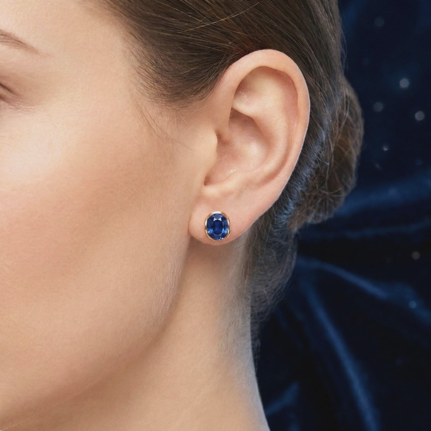 PromoOval blue simulated sapphire earrings in 18K gold vermeil bezel settings on dark blue velvet.