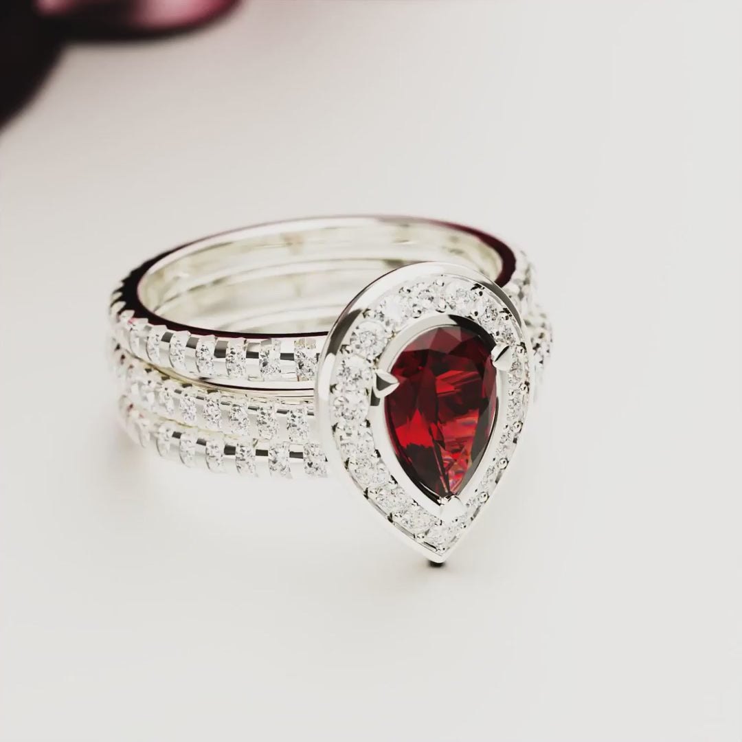 Crimson Teardrop: Bague Halo Rubis Poire - Argent S925