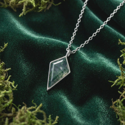 Model wearing the kite cut moss agate pendant necklace in S925 sterling silver against a soft forest background.