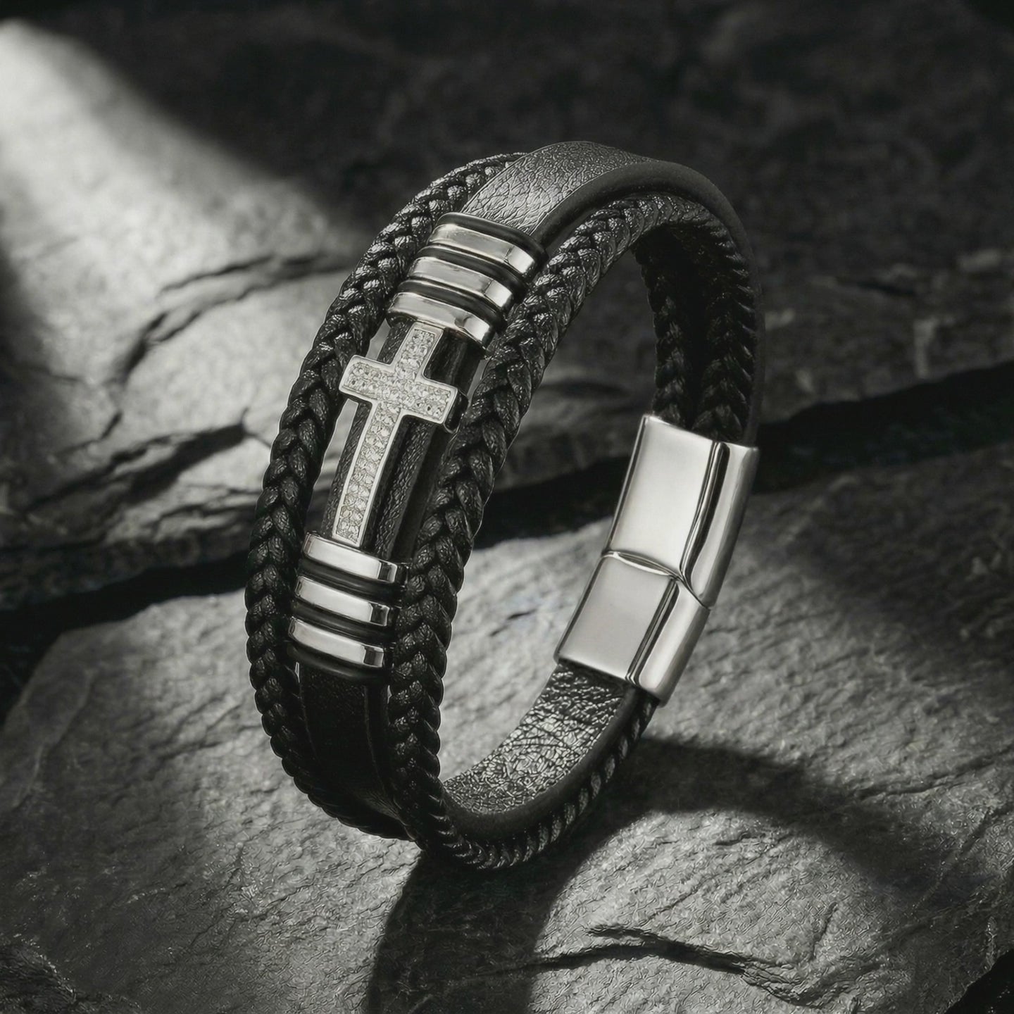 Men's jewelry is broken. Cheap pieces use base metals that oxidize and fail. We built the opposite. The Aegis Cross Bracelet combines premium braided leather with a Swiss Watchmaker Grade 316L stainless steel cross centerpiece. Designed to stack with your existing chains and rings, this bracelet delivers substantial weight and intentional presence without looking like you are trying too hard.