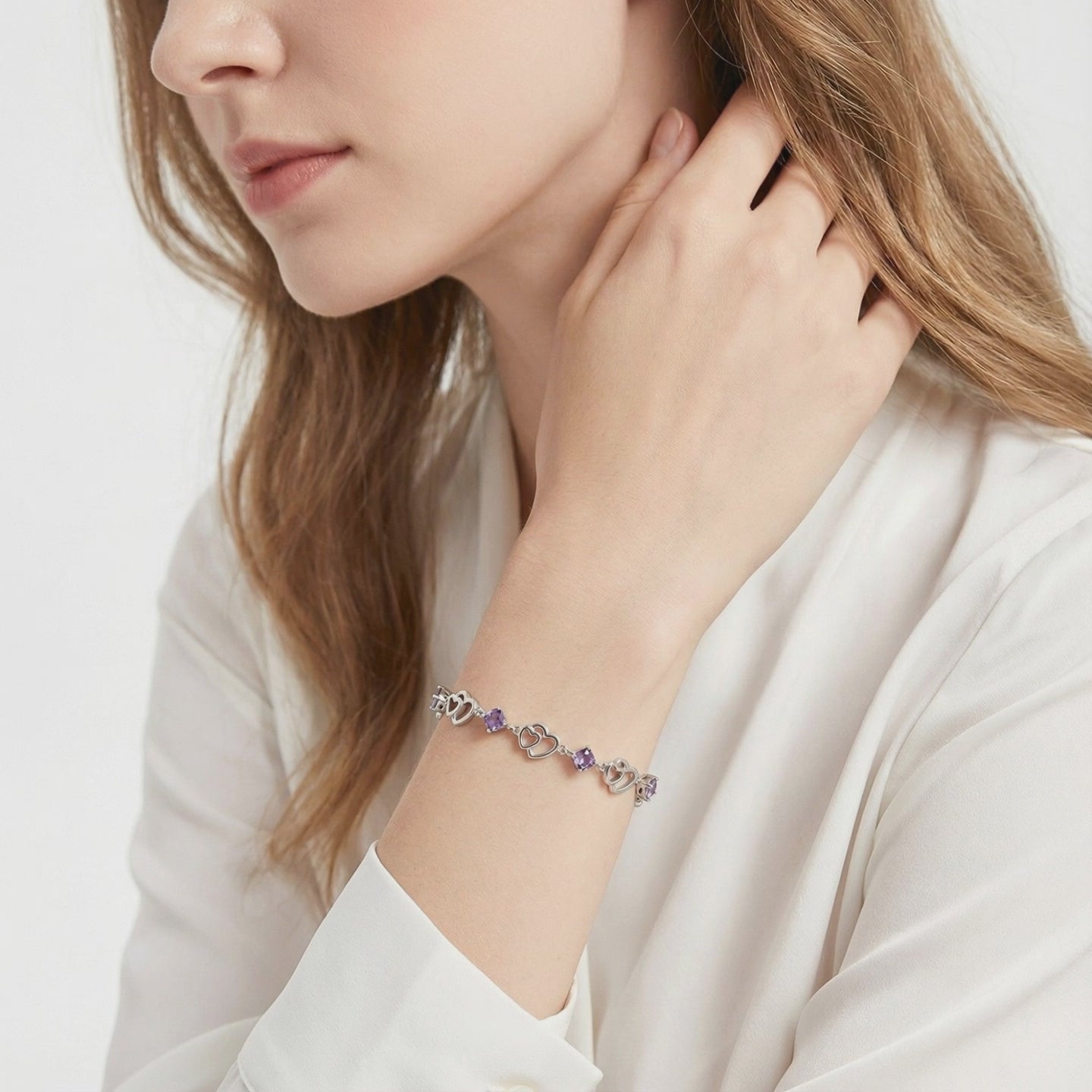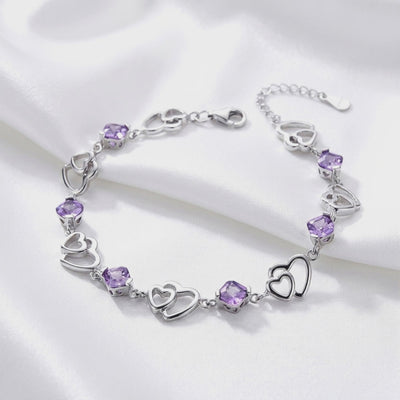 Macro detail of the sterling silver heart links and faceted purple simulated amethyst stones.