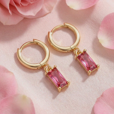 Silver emerald-cut pink tourmaline drop hoop earrings displayed on pink fabric with scattered rose petals.