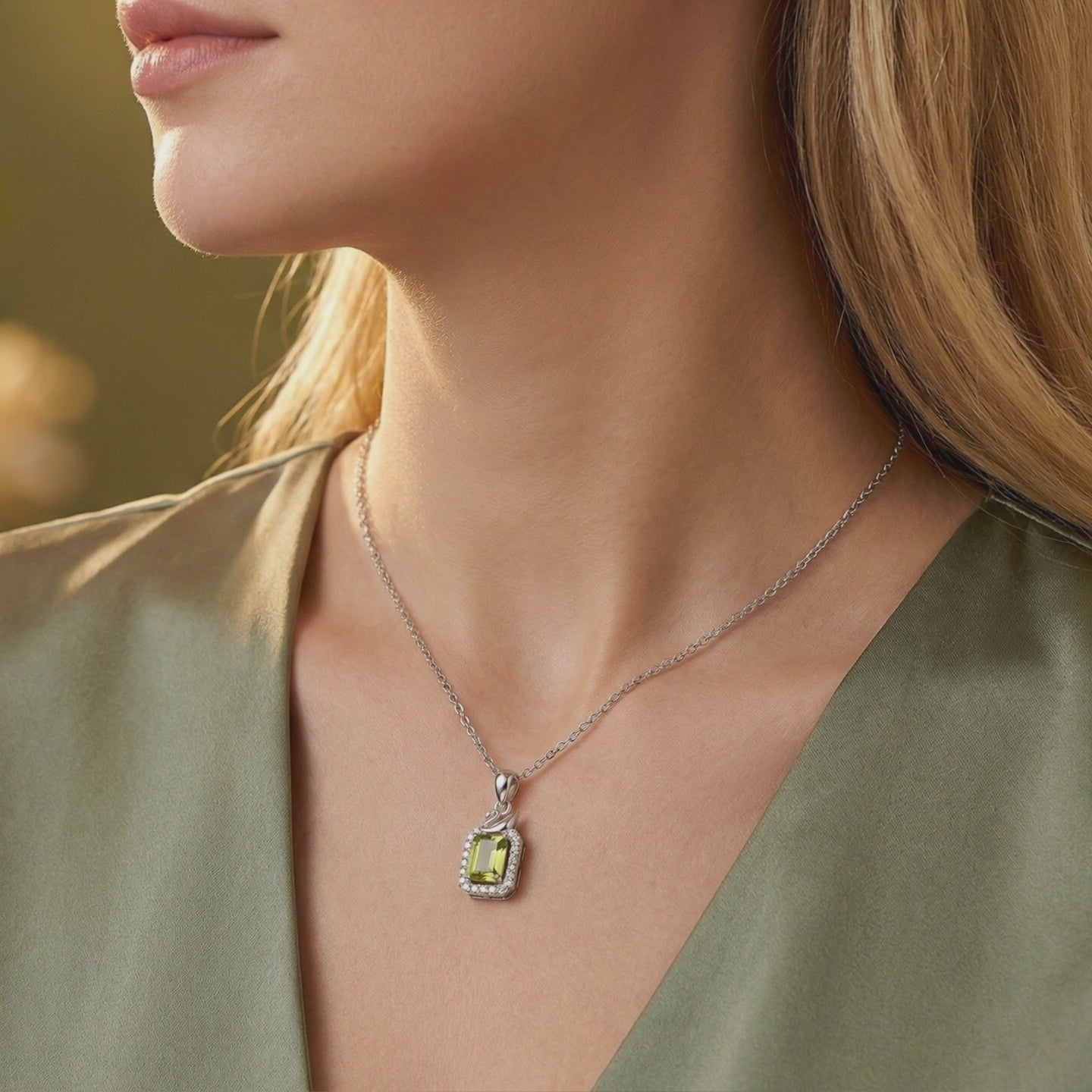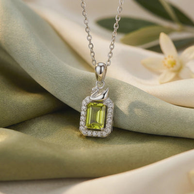 Radiate confidence with the Amelienne Pendant, a celebration of vitality and renewal. This exquisite necklace features a certified natural Peridot, cut in a sophisticated emerald shape that showcases the gemstone's characteristic \"lily pad\" inclusions—nature's own fingerprint and proof of its earth-born origin. Known historically as the \"Evening Emerald,\" this vibrant stone maintains its electric lime-green glow even under candlelight, making it the ultimate day-to-night accessory.