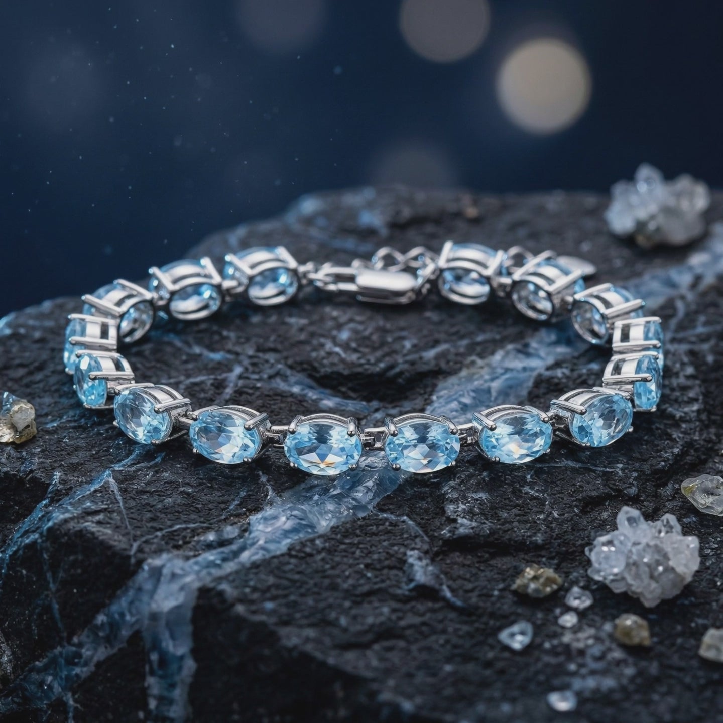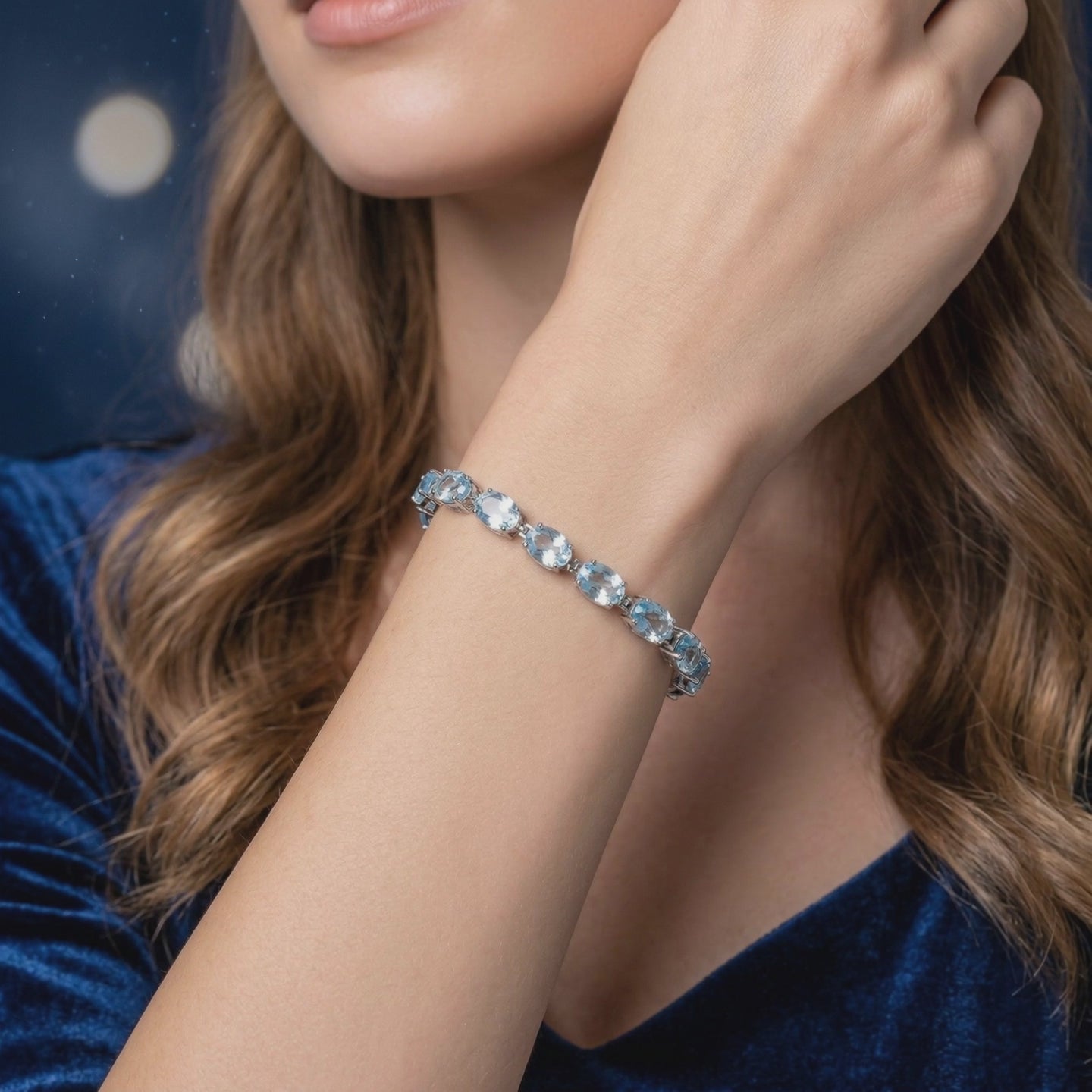 You don't need an occasion to wear an extraordinary masterpiece. Meet your new signature bracelet. This stunning design features sixteen substantial 6x8mm natural topaz stones, expertly faceted in a classic oval cut. Because natural topaz possesses exceptional, eye-clean transparency, our lapidaries utilize this cut to allow light to travel deeply into each stone, refracting a vivid, electric blue hue that commands attention. Achieved through safe, permanent, industry-standard color enhancement, this vivid saturation will remain brilliant for a lifetime.